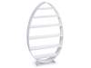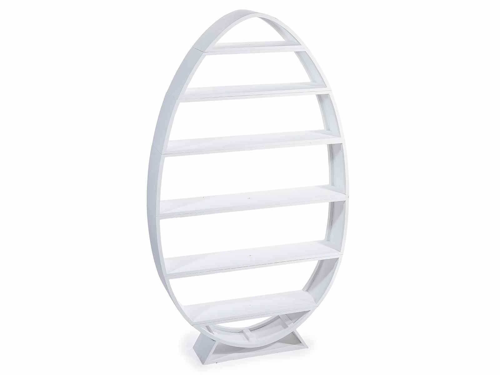 White wooden egg-shaped Easter display stands with 6 shelves. Ideal for Easter-themed shop windows.