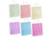 Large white paper shopping bags with colorful striped/polka dot print and twisted handle