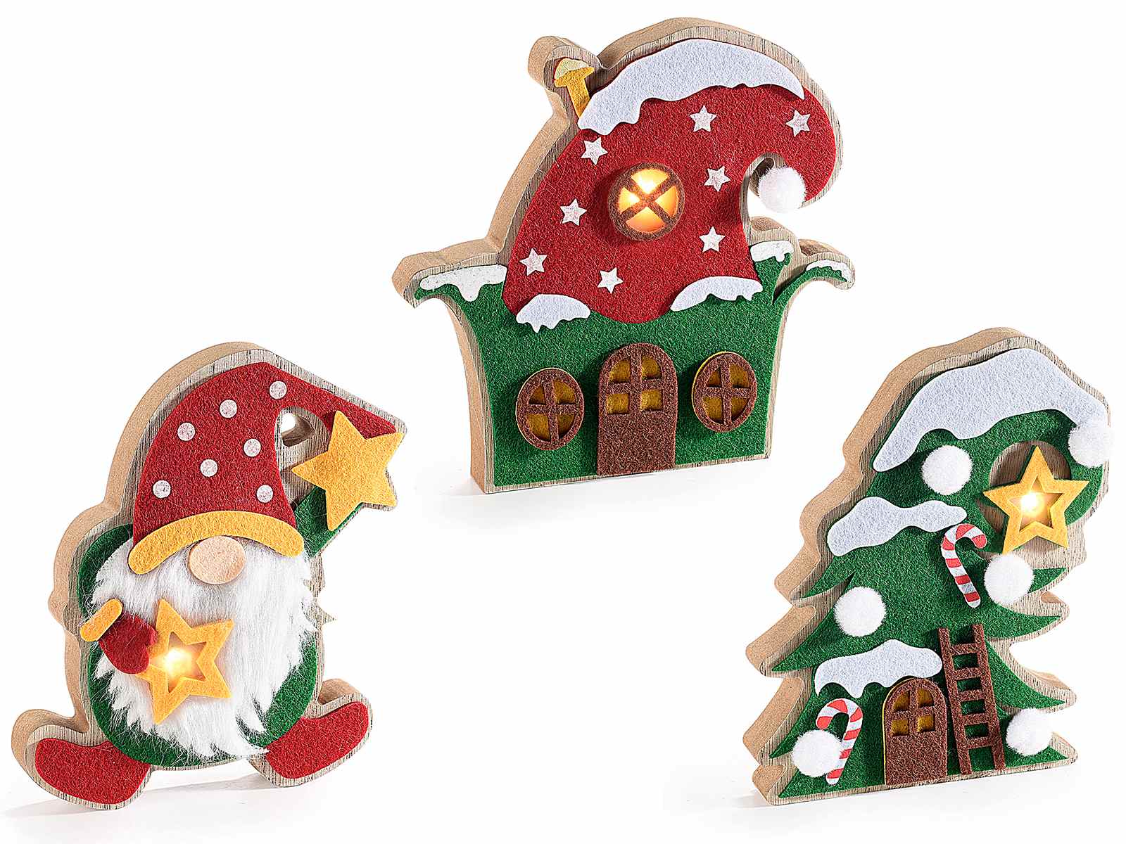 Wooden and cloth Christmas decorations with LED lights in the shape of a house, tree and gnome, enriched with festive details and a snow effect finish