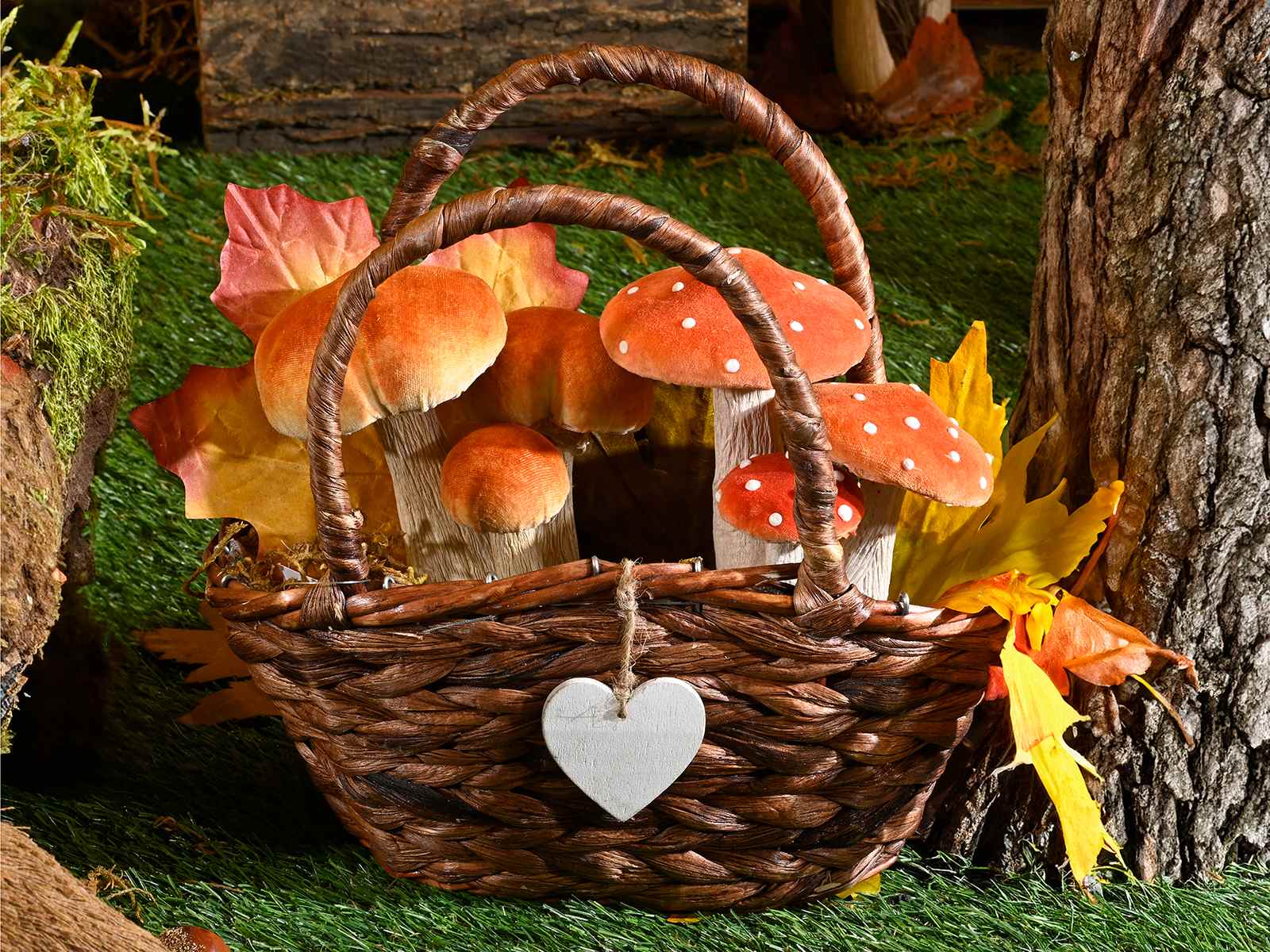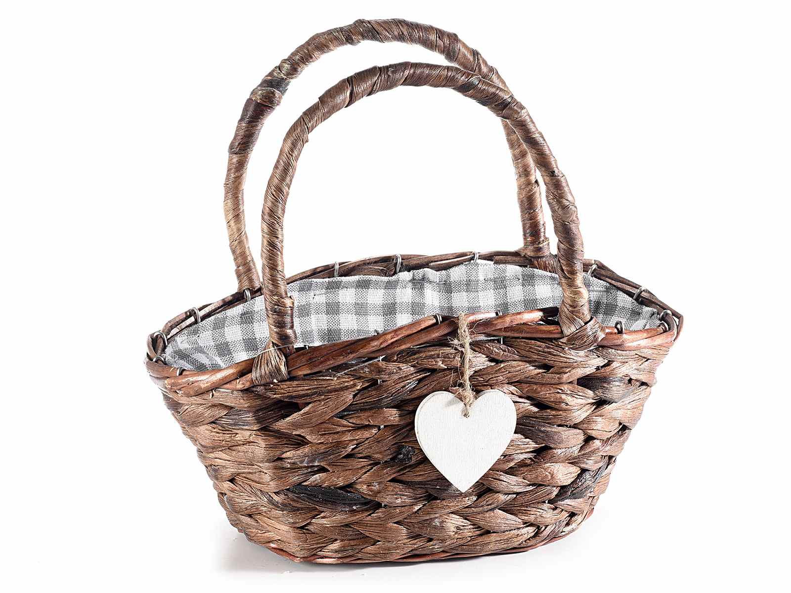 Wooden baskets with handles, wooden hanging heart and internal lining in checked fabric
