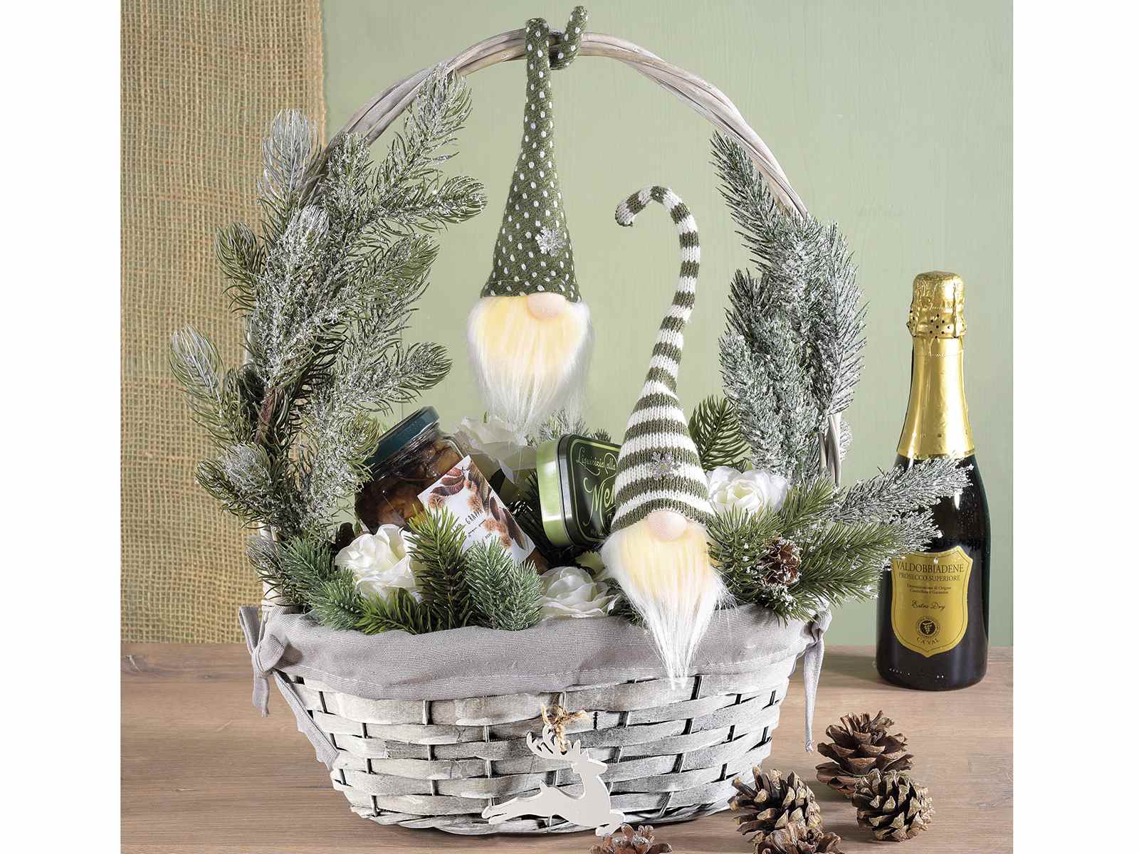 Wooden baskets with rigid handle, reindeer pendant, bow and grey fabric inside