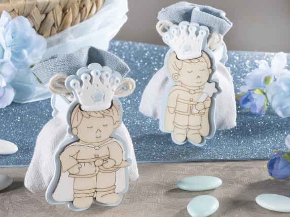 Baby birth favors with fabric bag for confetti with wooden prince application