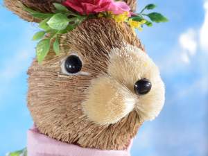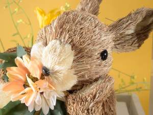 Easter bunnies with moldable ears in natural fiber with pink bow and decorative flowers cm12x21x30H (orecc.estese).