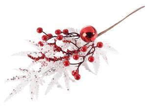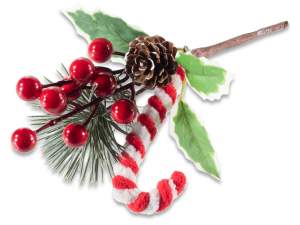 Christmas pick branches with red berries, artificial pine needles and candy cane cm 21 H (c/gambo 36). Bacca: Ø 1,3
