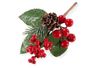 Decorative pick bouquet with pine needles and pine cone with artificial red berries cm 9 H (c/gambo 15,5). Bacca: Ø 1,3