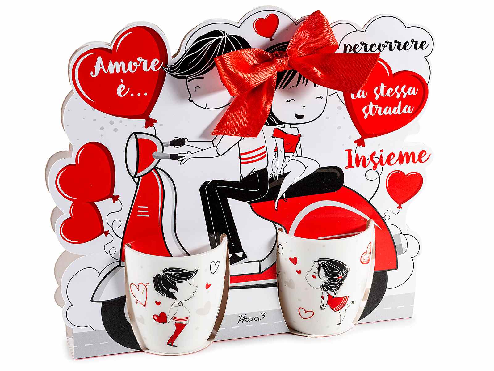 Set of porcelain coffee cups with a loving couple decoration in a shaped gift box with a bow, for Valentine's Day