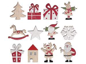 Wooden Christmas decorations with double-sided tape shaped as Santa Claus, gift boxes, angels, snowflakes and trees. Perfect for package sealers, gift wrapping and greeting cards. In a display of 72 pieces da cm 4x4,5H a 4x5,5H.