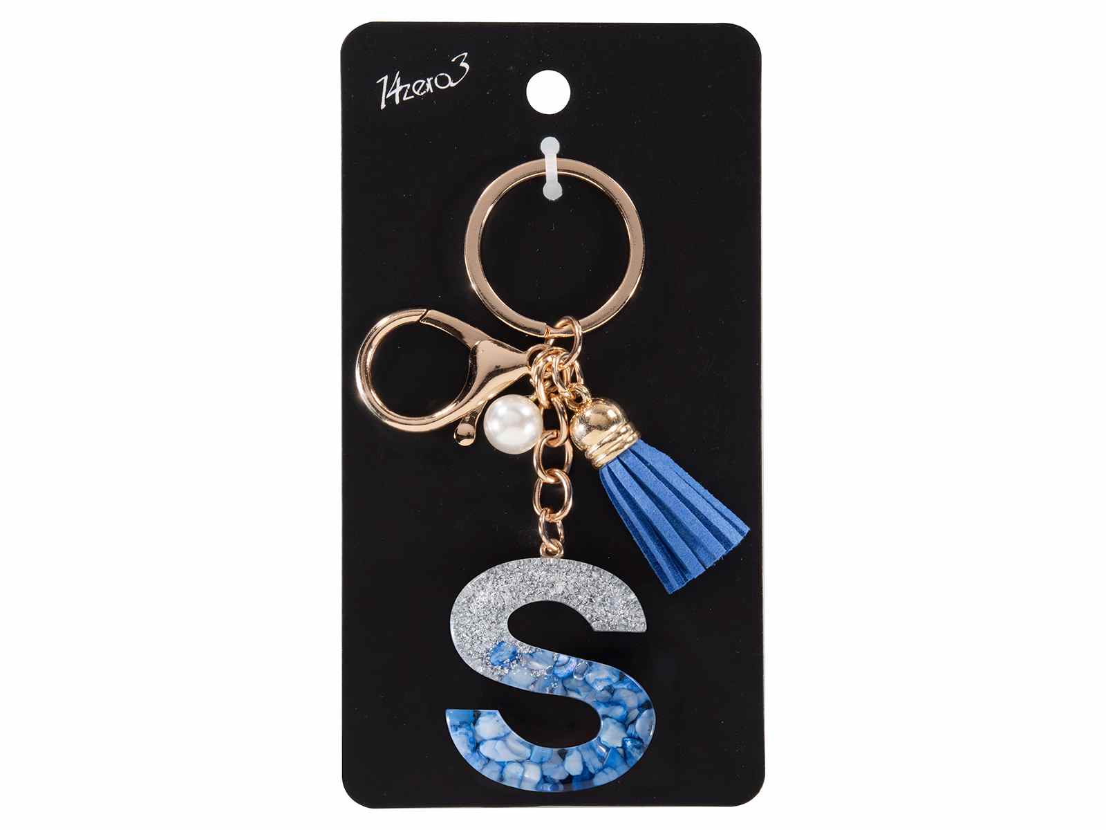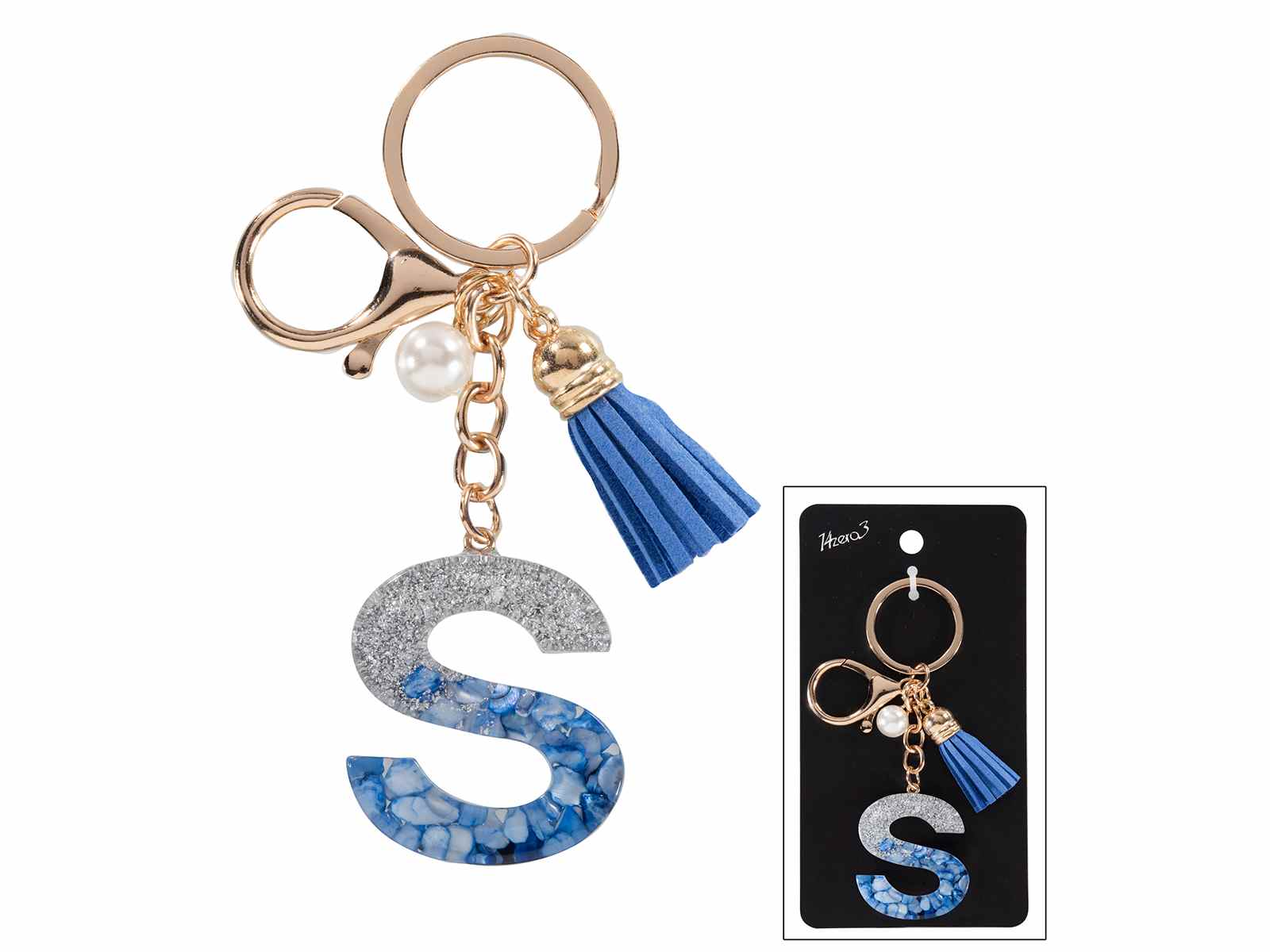 Breloque / porte-clés lettre E bronze avec strass et pompon