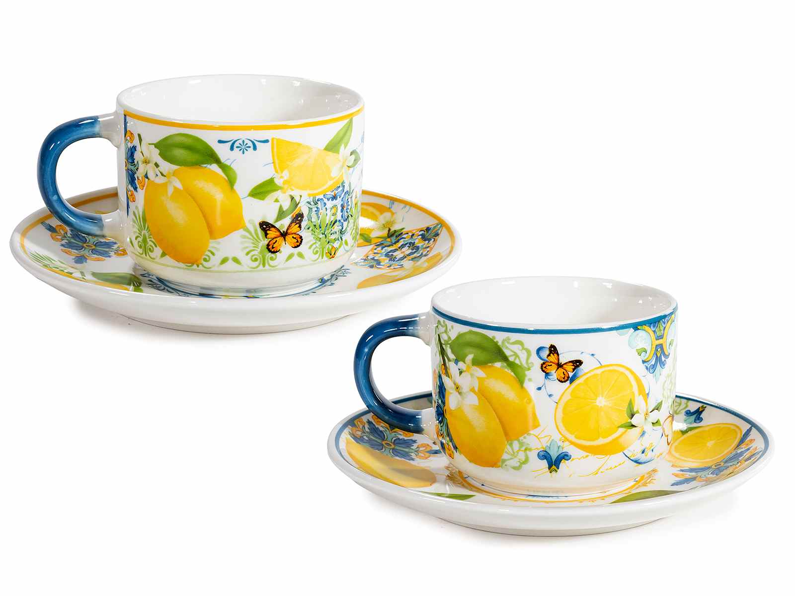 Tasses en porcelaine avec soucoupes et décor imprimé citron/majolique, dans un coffret cadeau