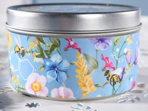 Bougies parfumées dans une boîte ronde en métal avec décor de fleurs et d'abeilles