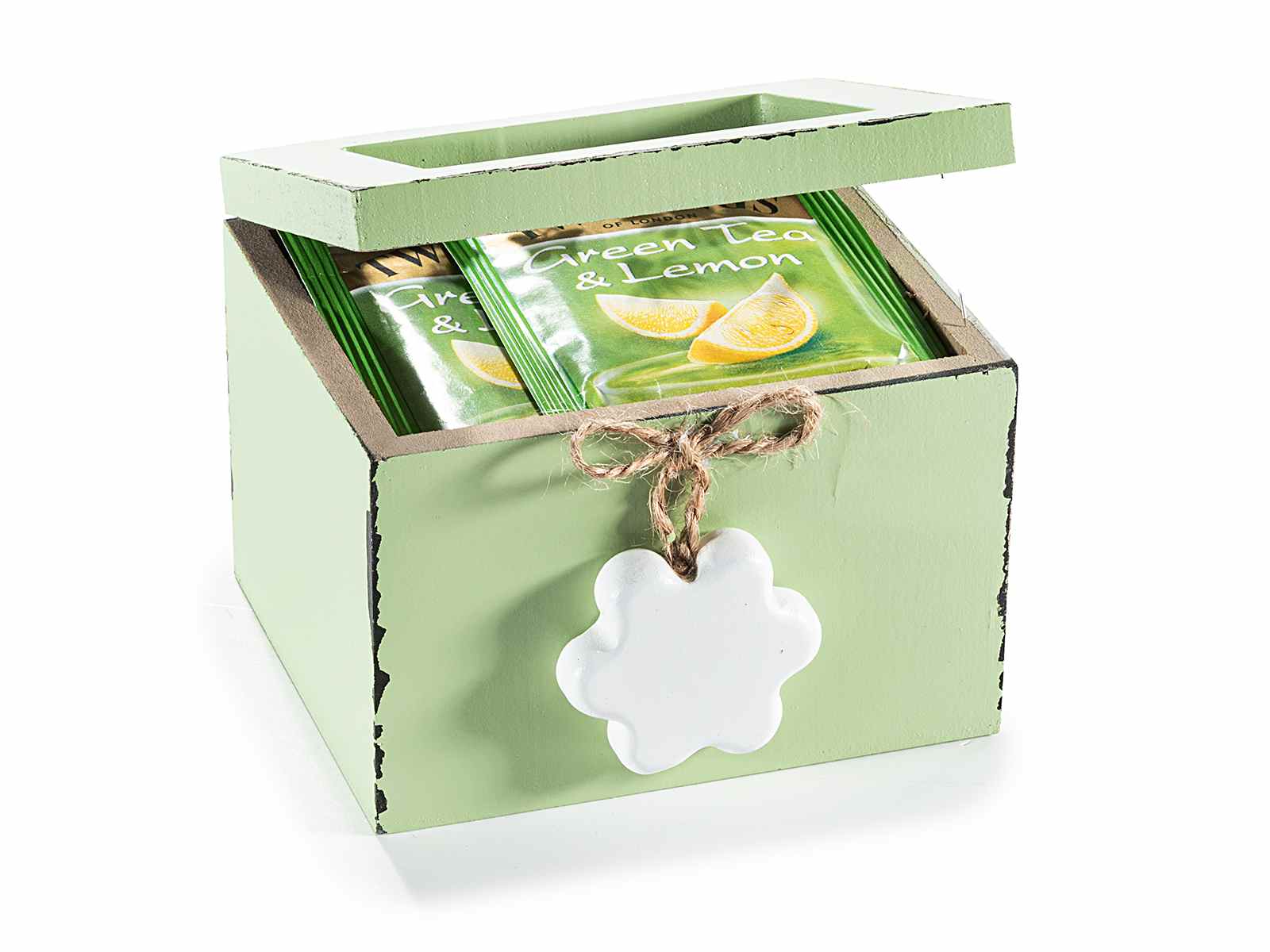 Boîtes à thé et à épices en bois et verre transparent, décorées d'un pendentif en forme de fleur et d'un nœud en jute.