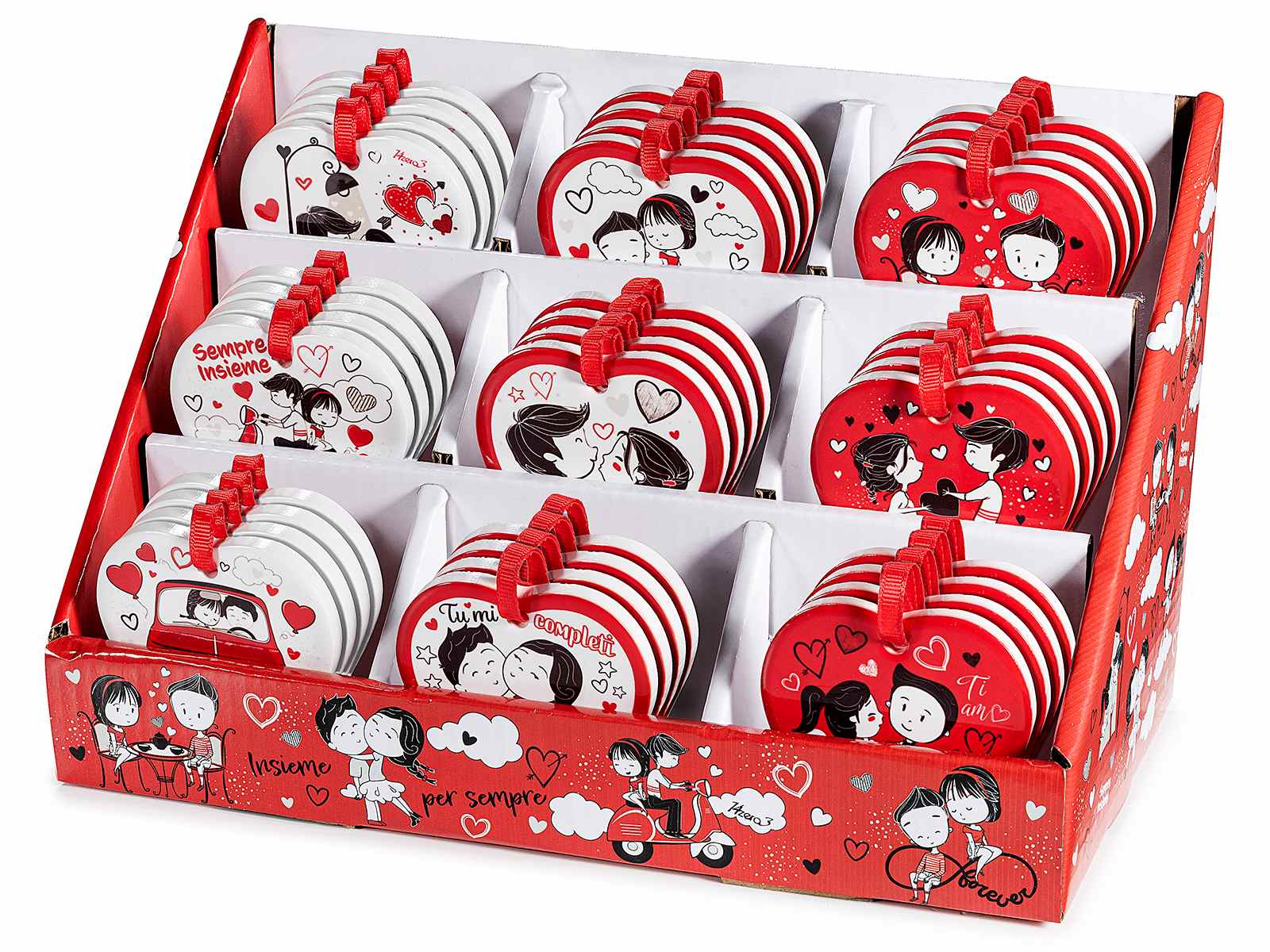 Cœurs décoratifs en céramique ornés d'un motif d'amour et munis d'une ficelle pour les suspendre. Présentés en ensemble de 36 pièces.