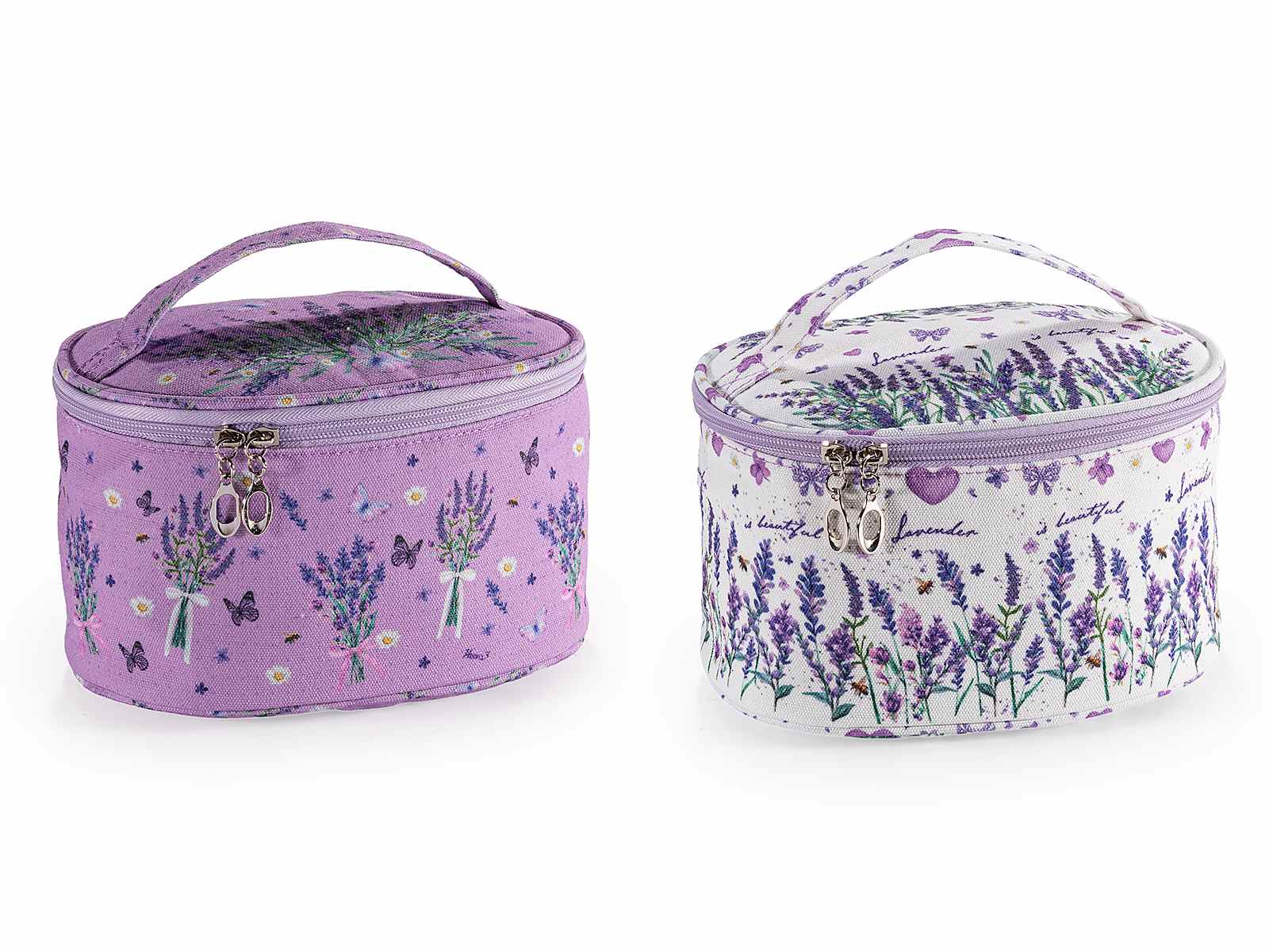 Trousse de maquillage en tissu imprimé lavande, couvercle à 4 compartiments, fermeture éclair et poignée