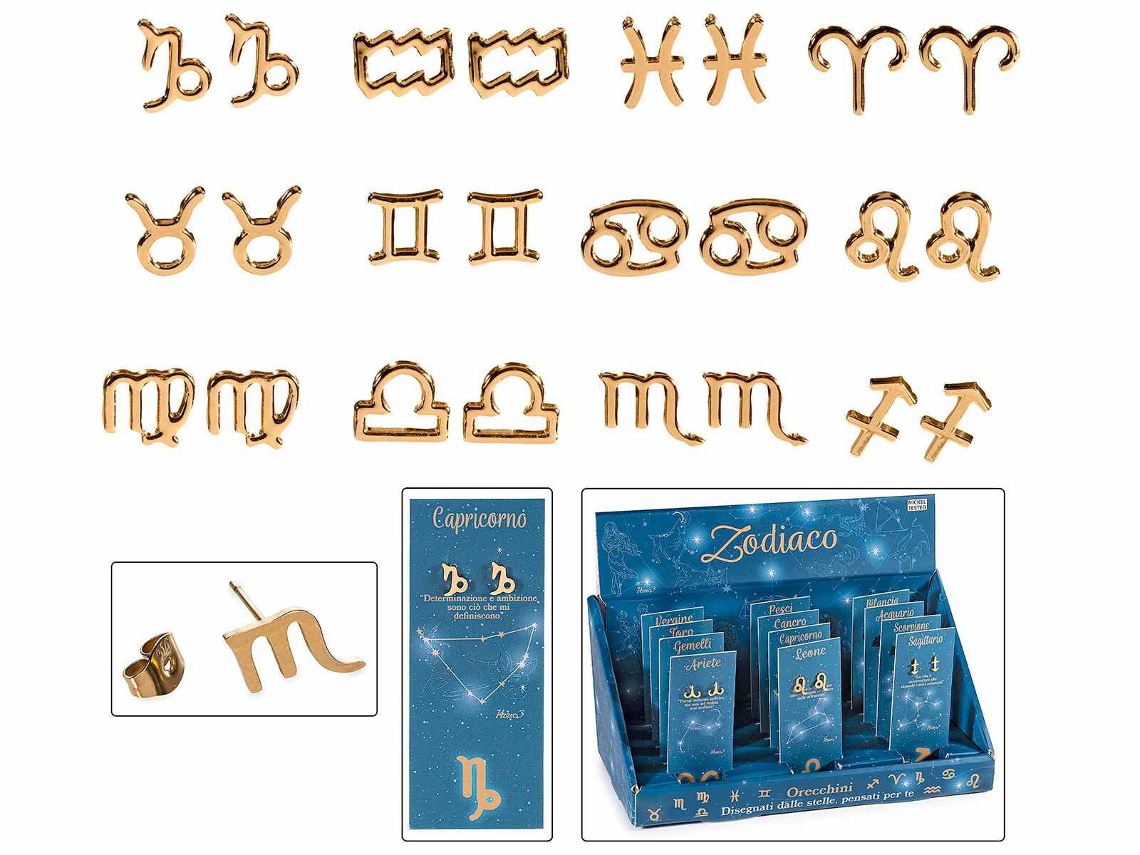 Présentoir de 24 boucles d'oreilles en métal avec signes du zodiaque