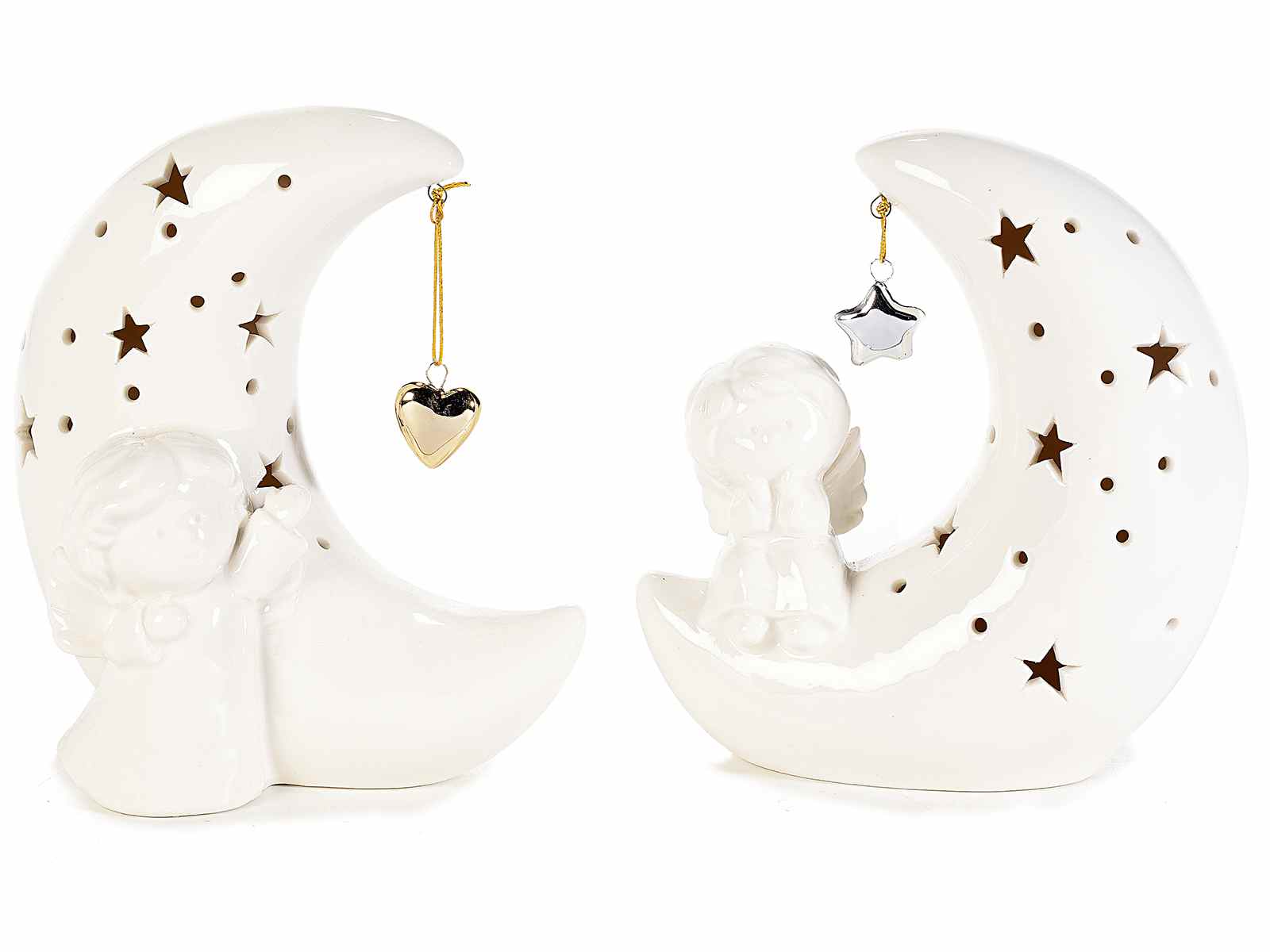 Anges sur une lune en céramique lumineuse ornée d'étoiles, avec un pendentif métallique et des lumières LED