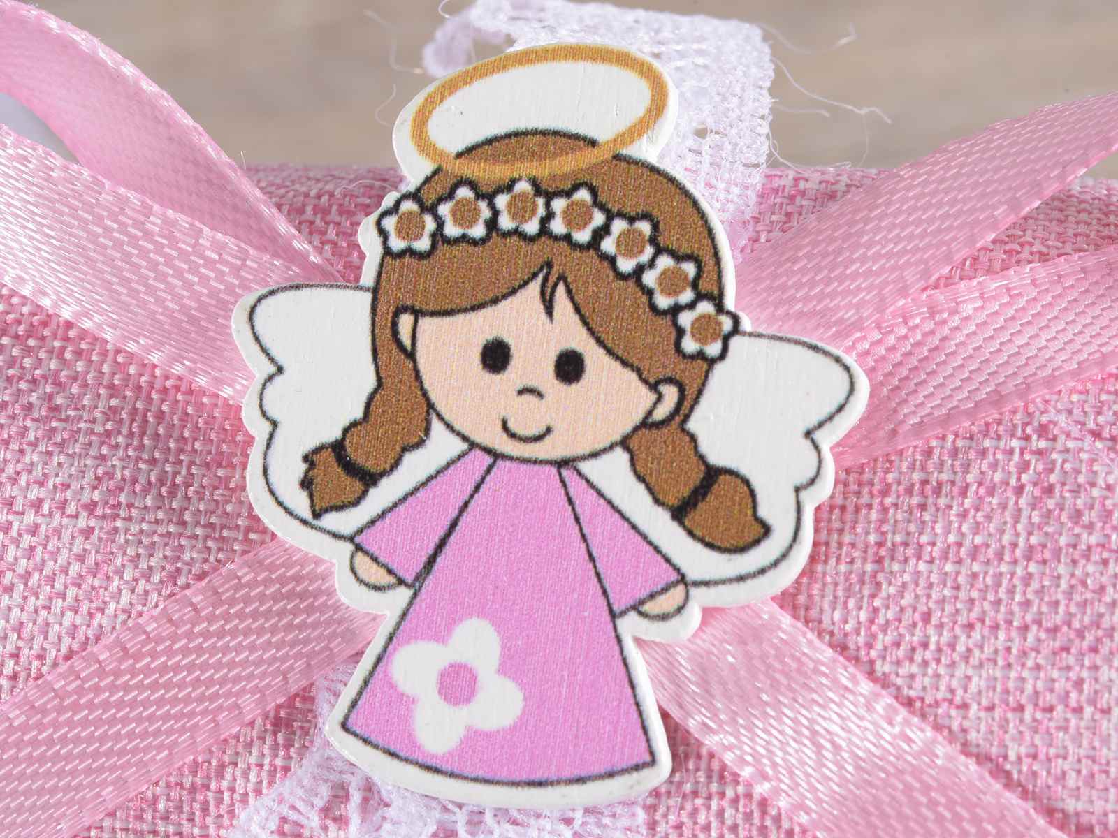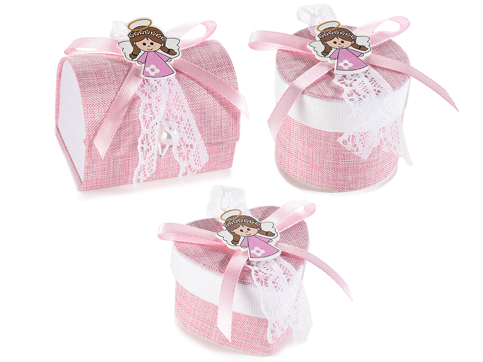 Boîtes à dragées en tissu avec décorations en bois et nœuds roses pour petites filles