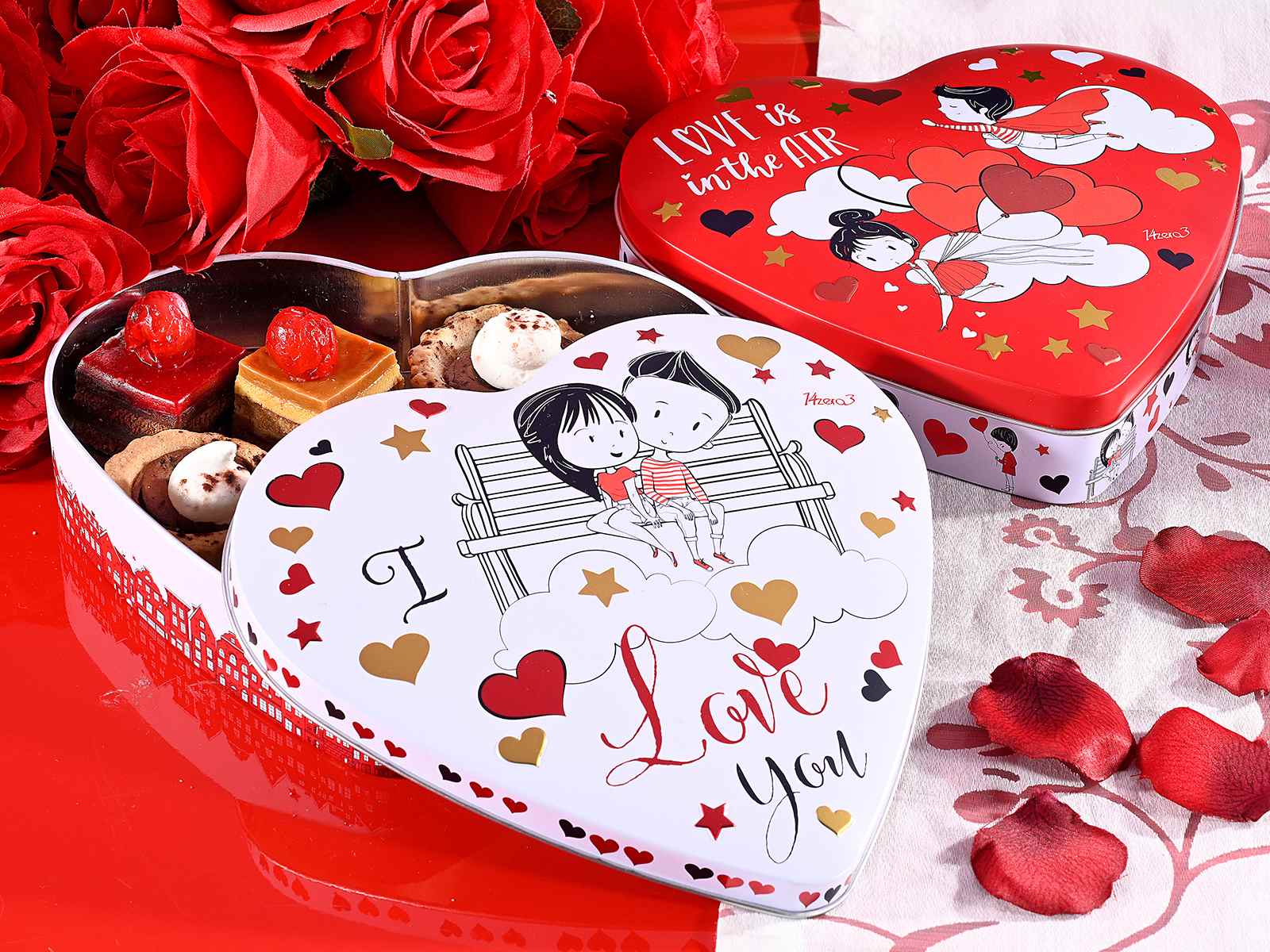Boîte alimentaire en métal en forme de cœur avec décorations