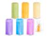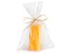 De grandes bougies colorées en forme de fleur, présentées dans un emballage unique et transparent orné d'un ruban.