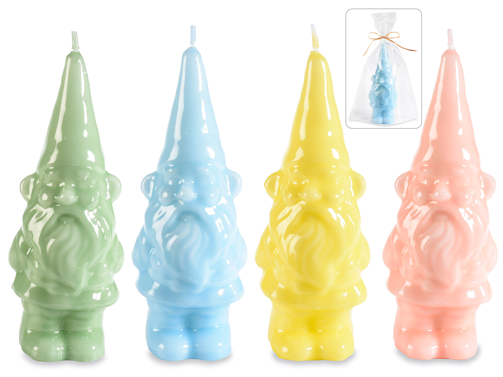 Bougies individuelles transparentes et brillantes en forme de gnome, avec un ruban.