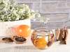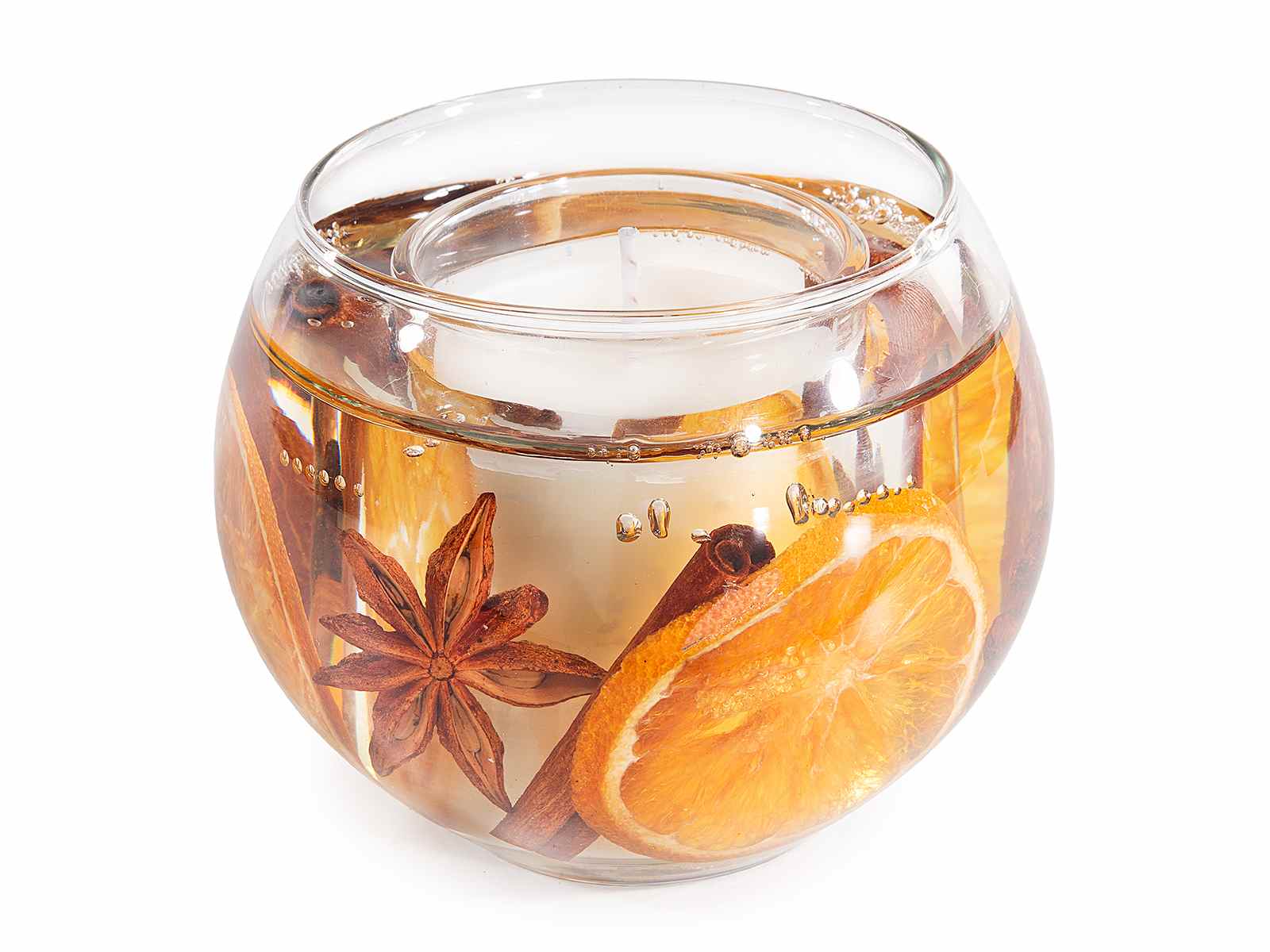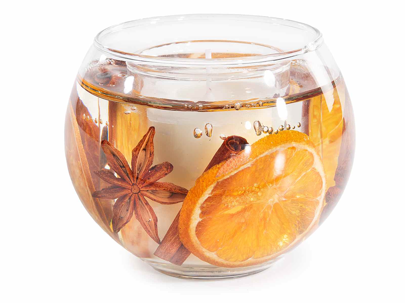 Bougies parfumées dans un pot en verre avec gel, orange, cannelle et clous de girofle naturels