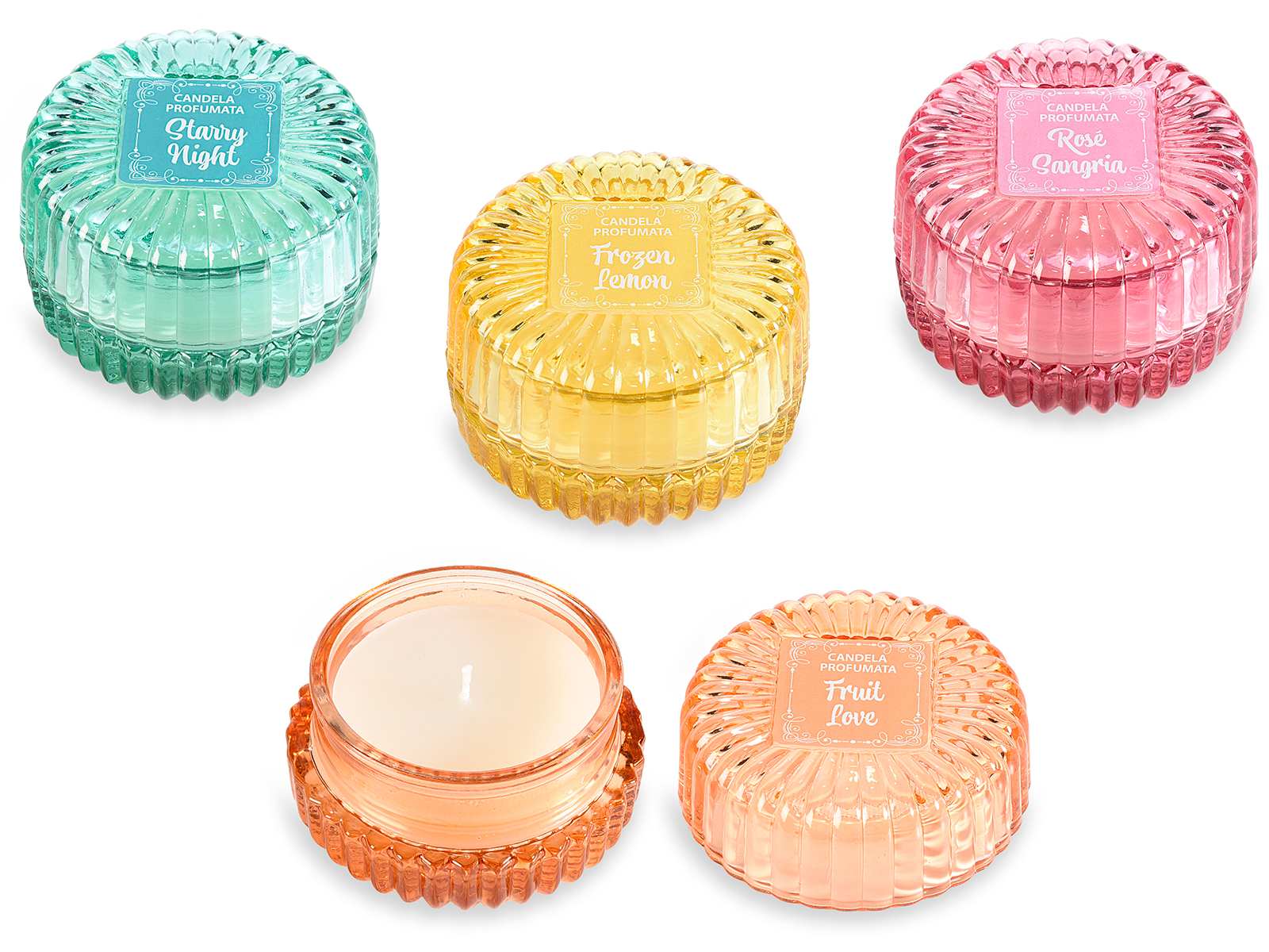 Bougies parfumées dans un pot en verre avec un bord cannelé et un couvercle