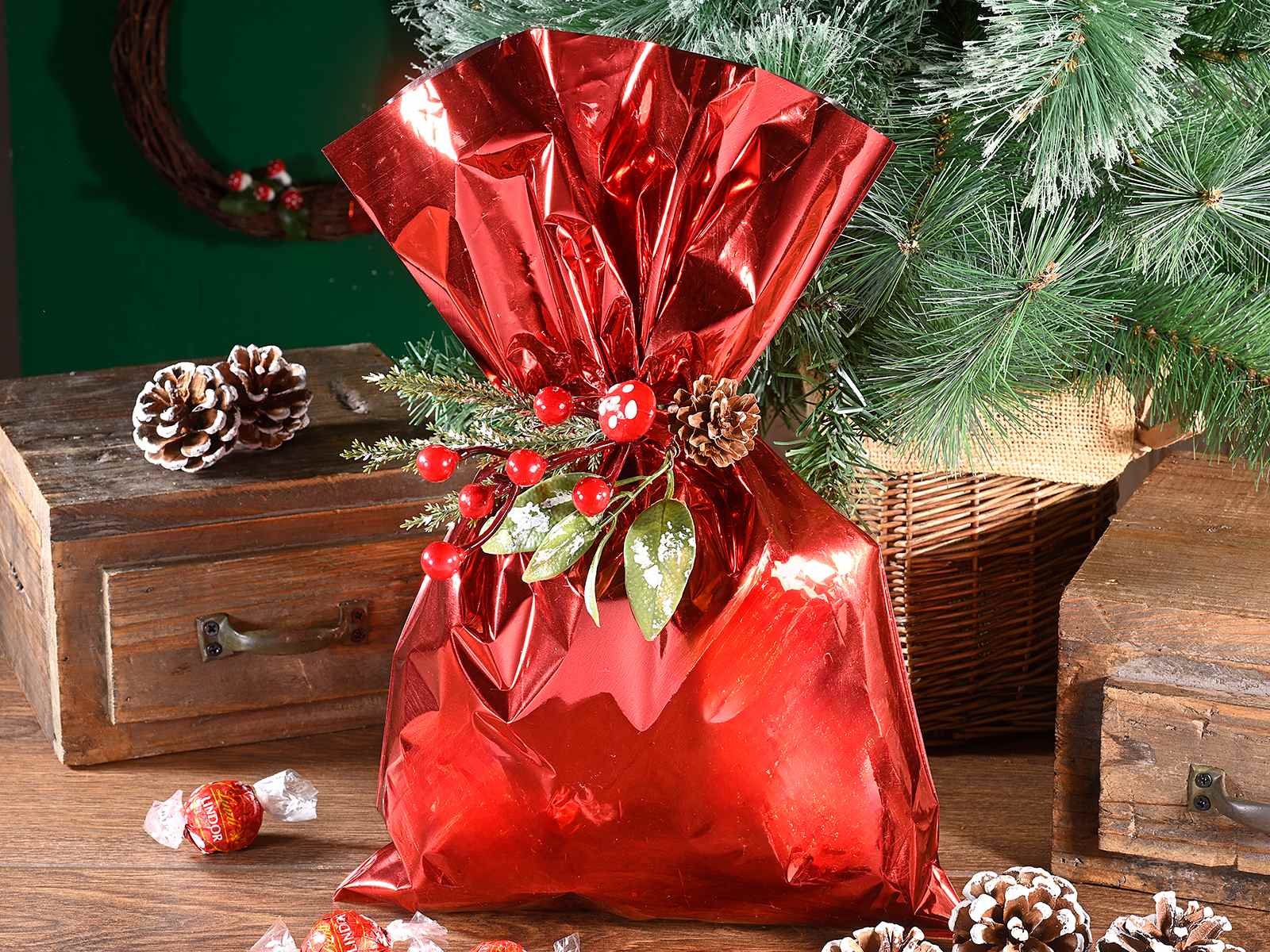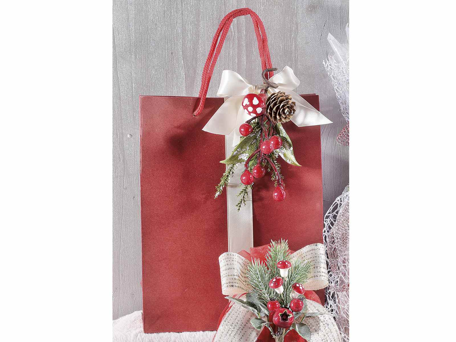 Bouquet enneigé avec pomme de pin, champignon et fruits