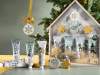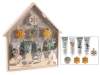 Coffret cadeau / emballage de Noël avec produits pour le corps en forme de maison avec 5 crèmes pour les mains, 2 bombes de bain, 1 décoration en bois. Avec des décorations brillantes semblables à de l'or
