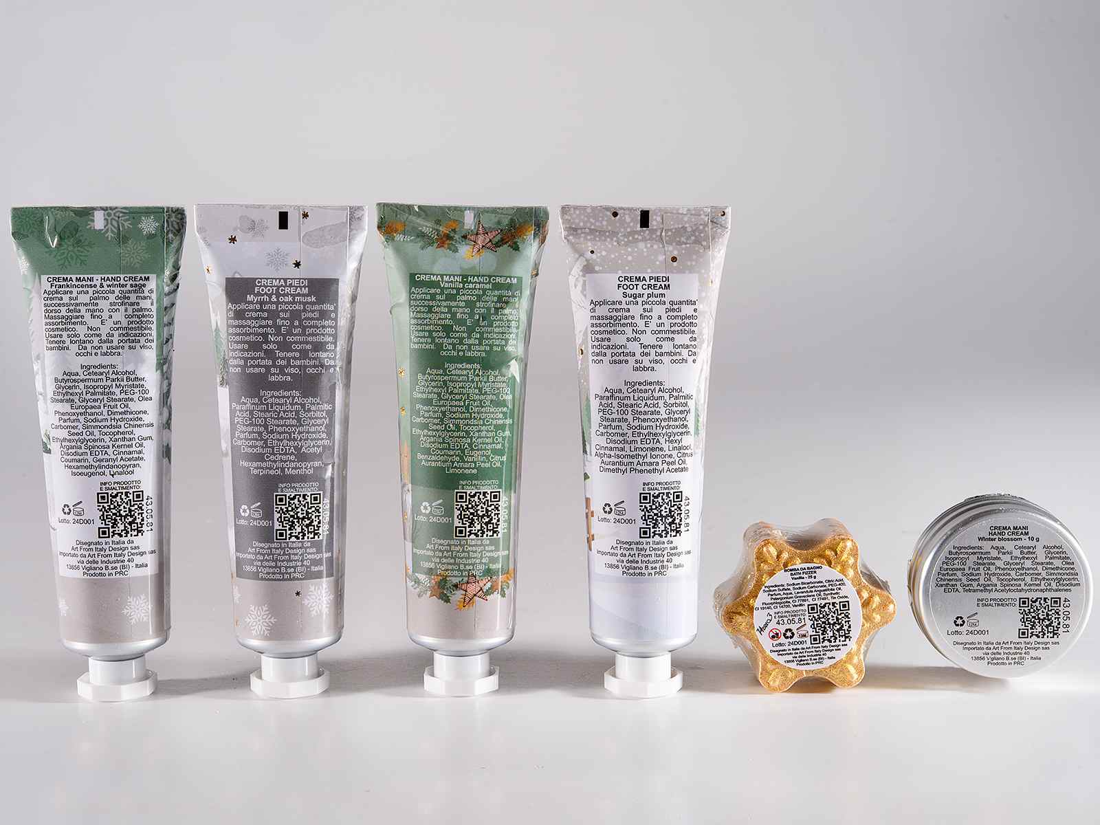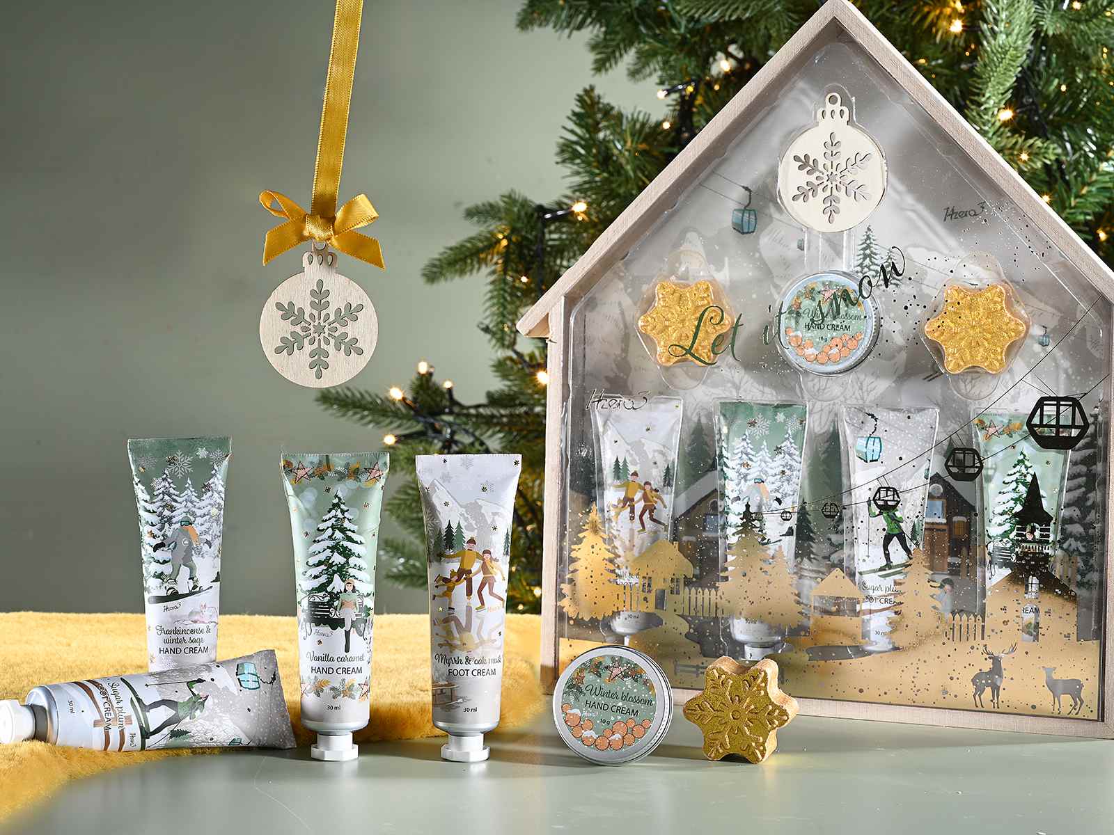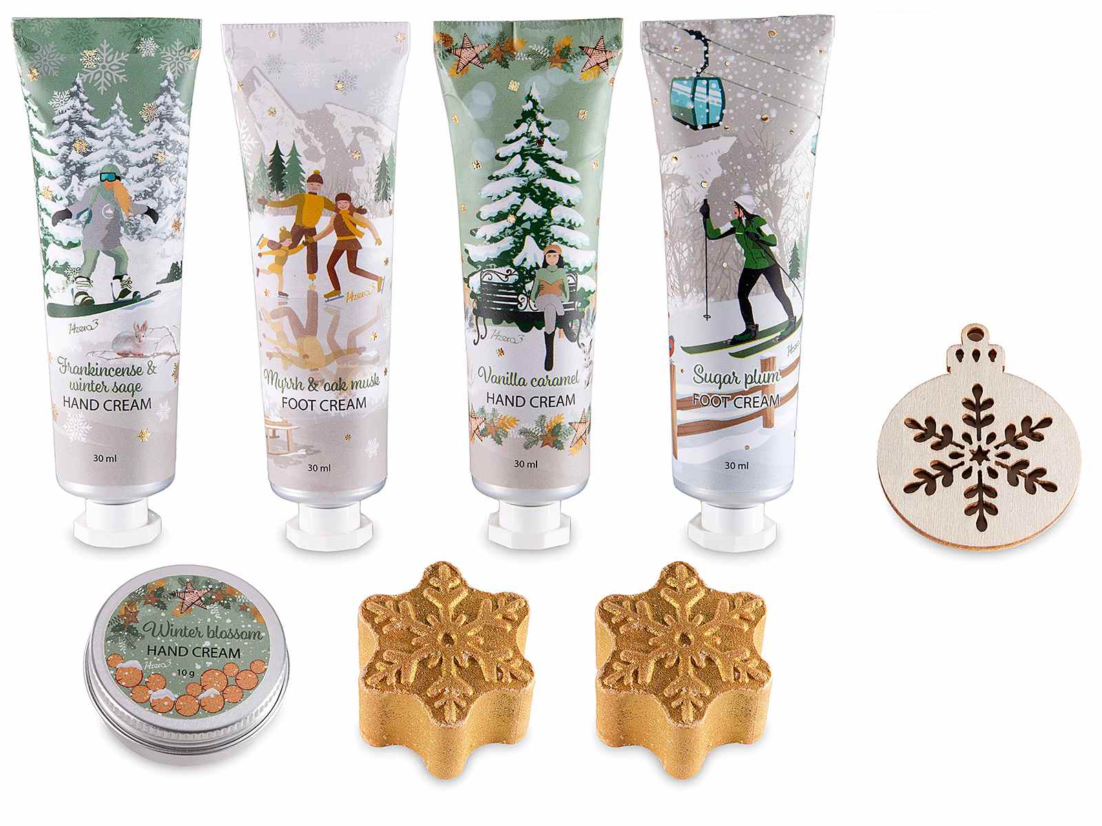 Fragranze: Frankincense & Winter Sage,Vanilla Caramel -Crema Mani Winter Blossom: 10g -Crema Piedi: 30ml -Fragranze: Myrr&Oak Musk,Sugar Plum -Bomba da 25g Vanilla -Decoro: 4,5x5,5H