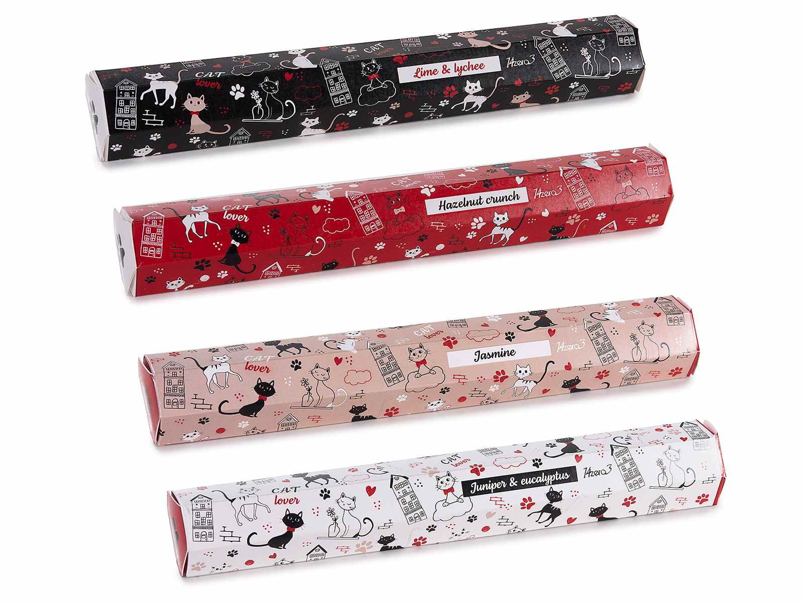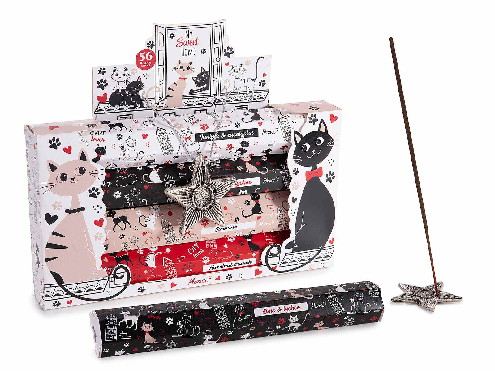 Coffret cadeau de 4 tubes avec 14 bâtons d’encens avec porte-encens en métal en forme d’étoile, fantaisie chat