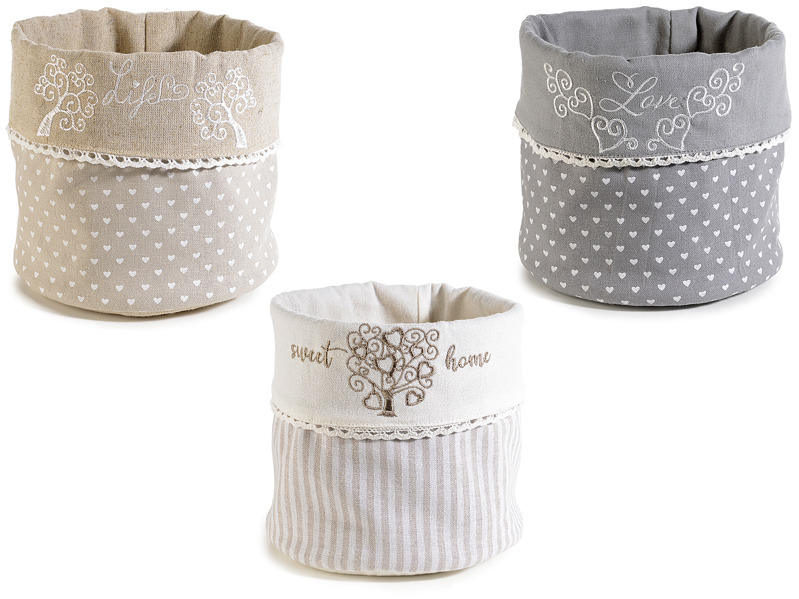 Paniers en tissu avec broderie arbre de vie et dentelle
