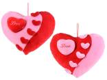 Coussins rouges en forme de cœur, rembourrés et brodés de l'inscription « Je t'aime », ornés de cœurs décoratifs et munis d'une ficelle pour les suspendre, parfaits pour la Saint-Valentin.