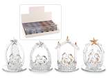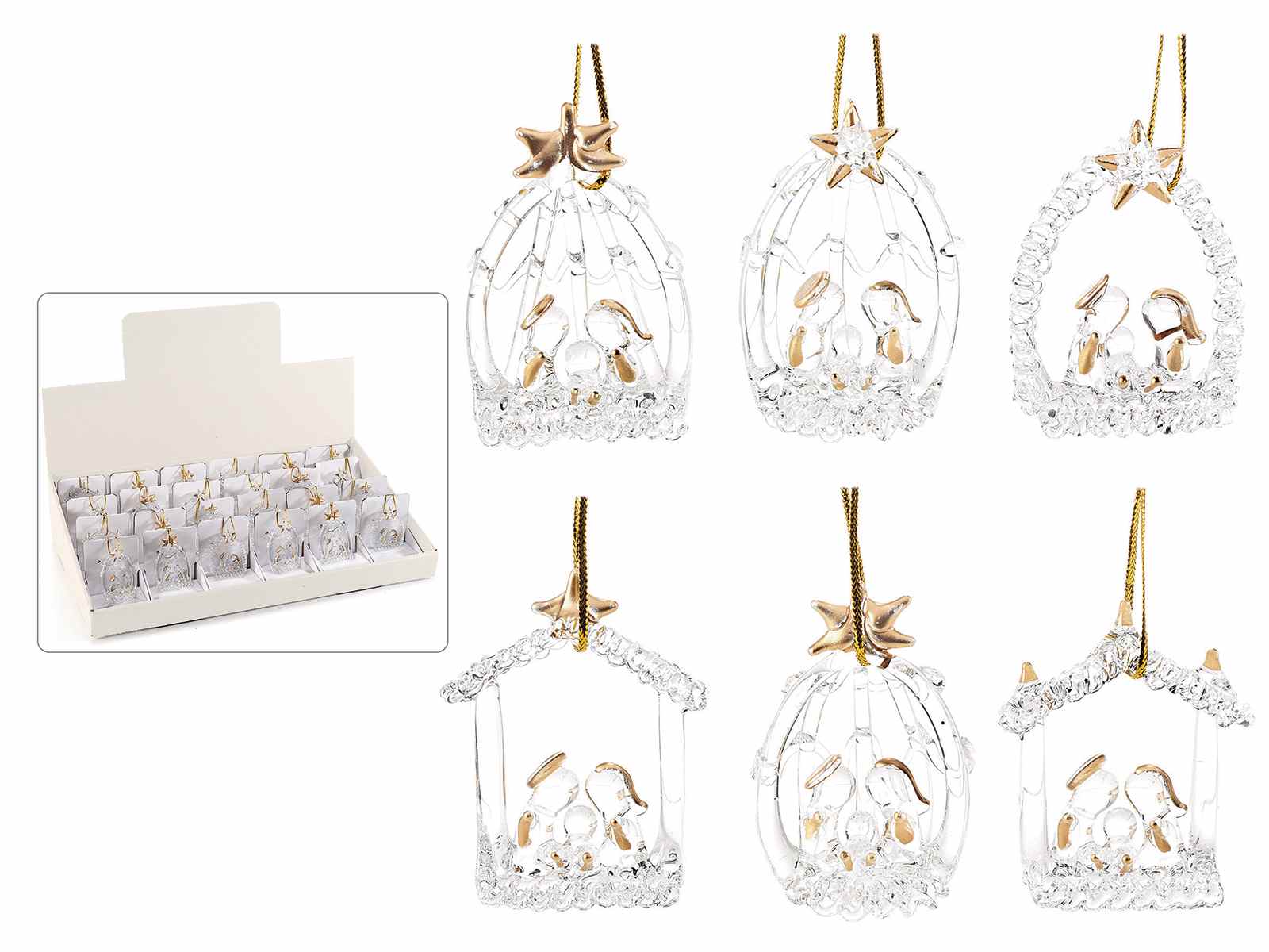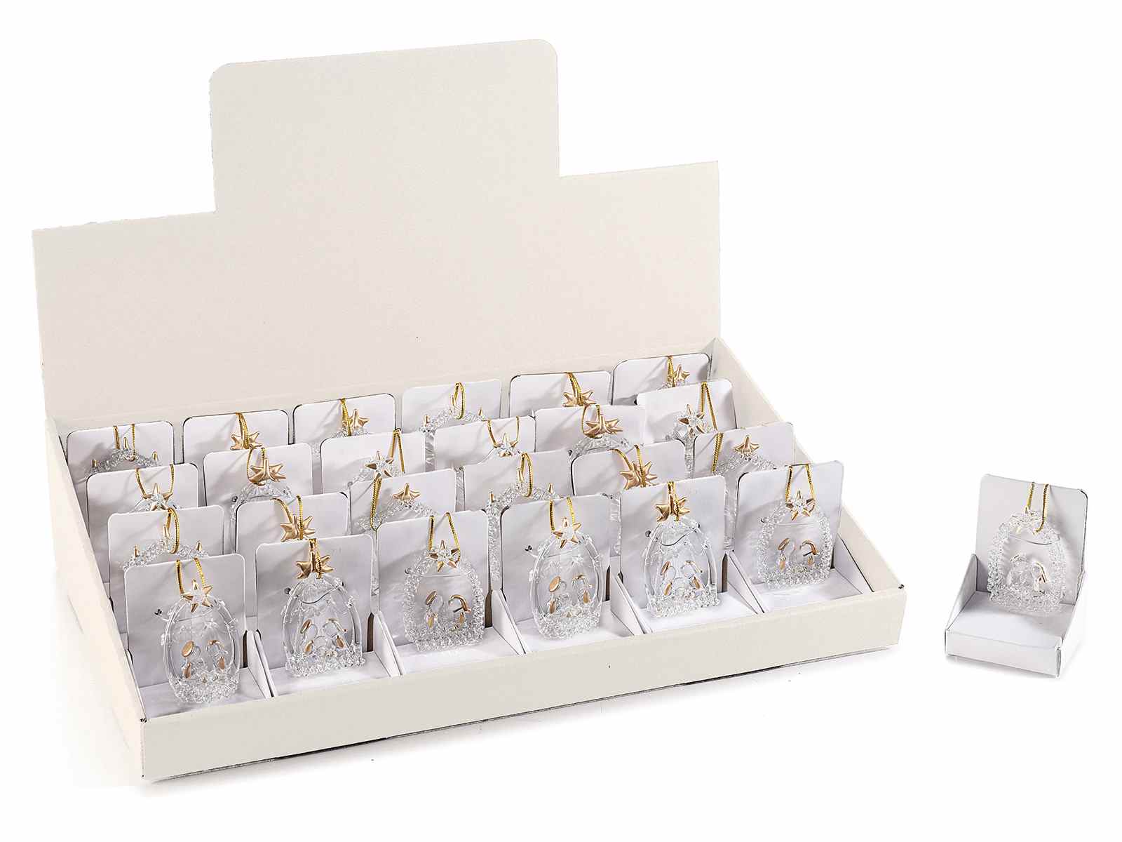 Figurines de crèche suspendues en verre dans une boîte individuelle, dans un présentoir de 24 pièces