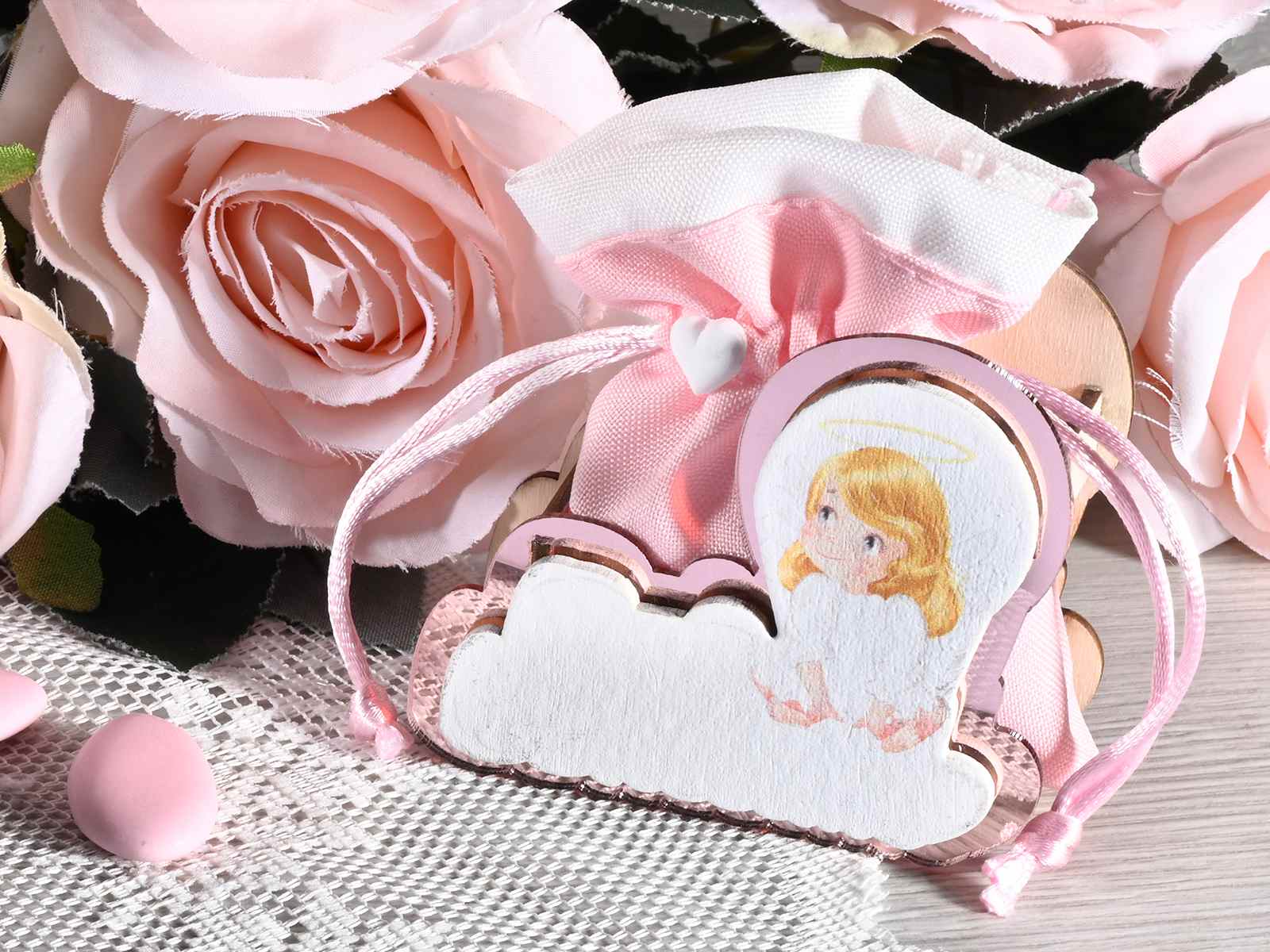Décorations en bois sur le thème de la naissance pour les petites filles, comprenant un sac rose à cordon et un cœur décoratif. À personnaliser soi-même.