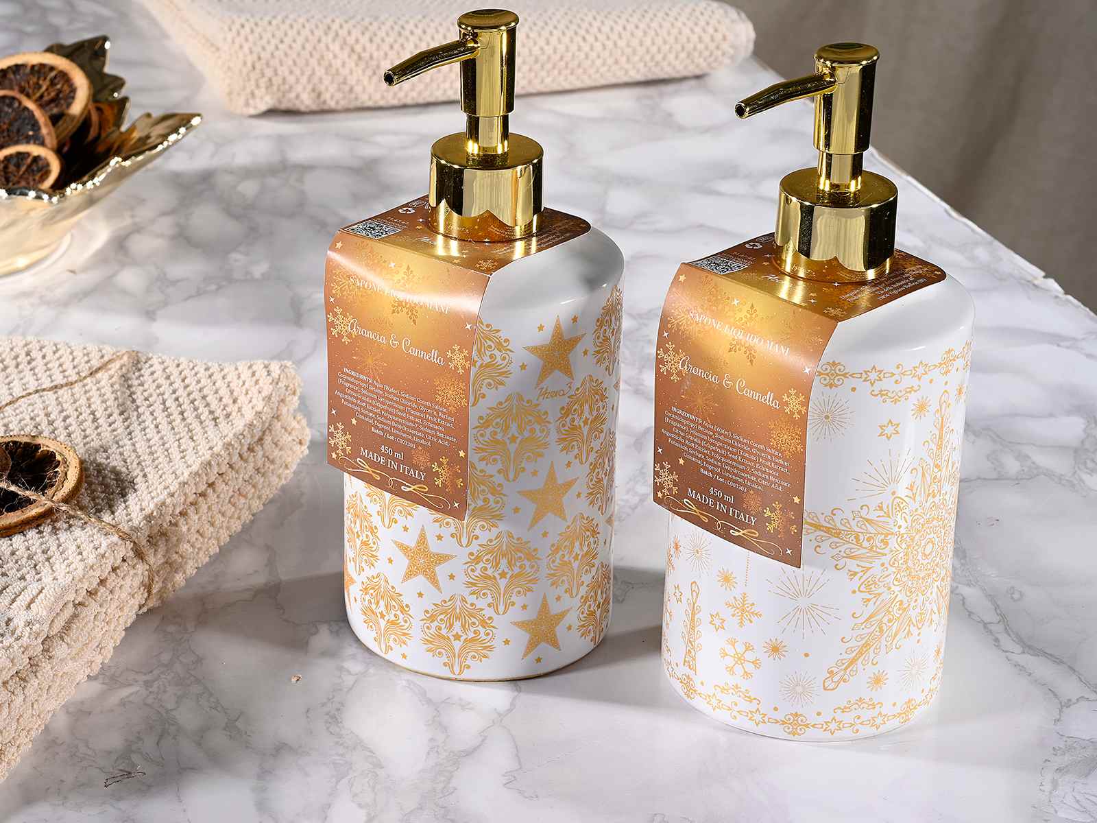 Distributeur de savon pour les mains parfumé à l'orange et à la cannelle en céramique avec imprimé nœuds et étoiles