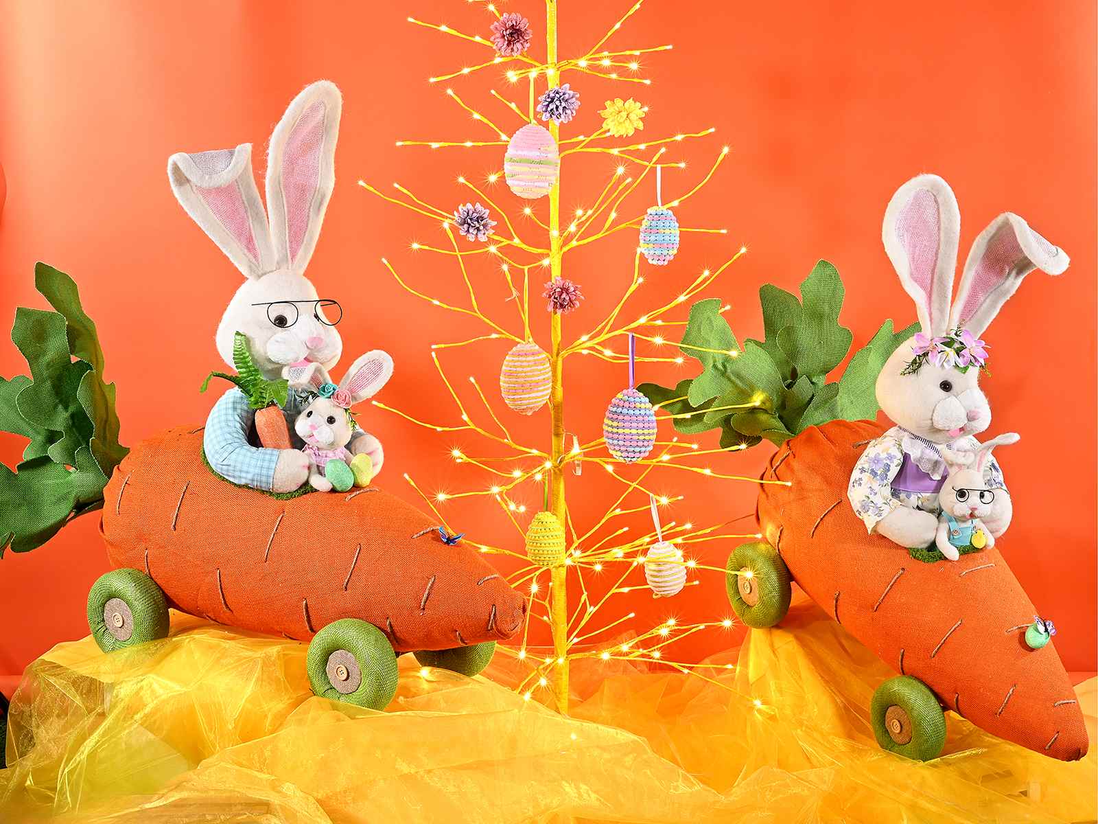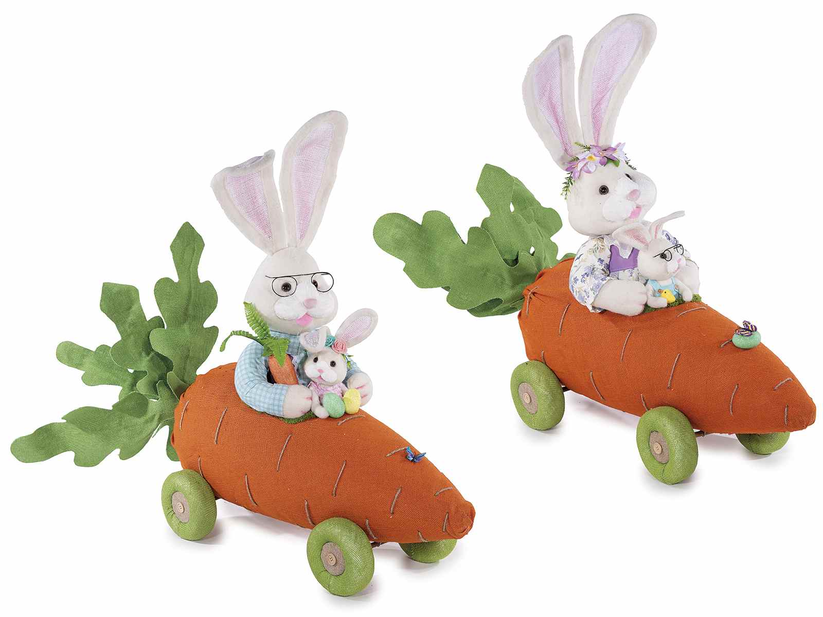 Grands lapins décoratifs en fausse fourrure avec bébé lapin dans une voiture carotte pour les décorations de Pâques