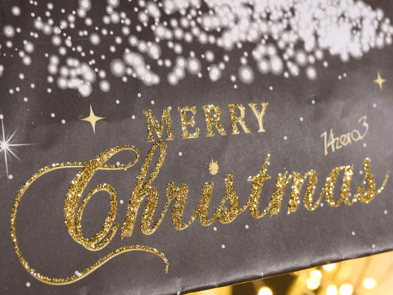 Sacs cadeaux/sacs de Noël/grands sacs de courses en papier rigide avec bordure à paillettes dorées et motifs festifs. Parfaits pour emballer les cadeaux avec style et créer des emballages élégants pour les fêtes.
