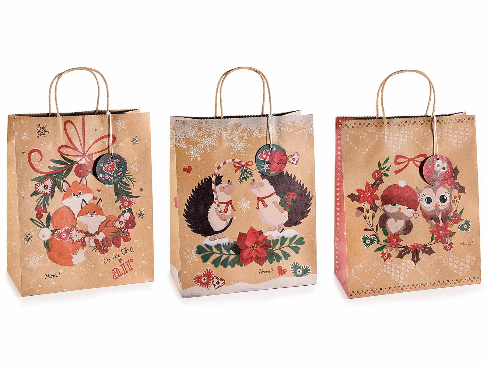 Sacs/enveloppes en papier naturel avec des animaux amoureux et des décorations de Noël avec étiquettes