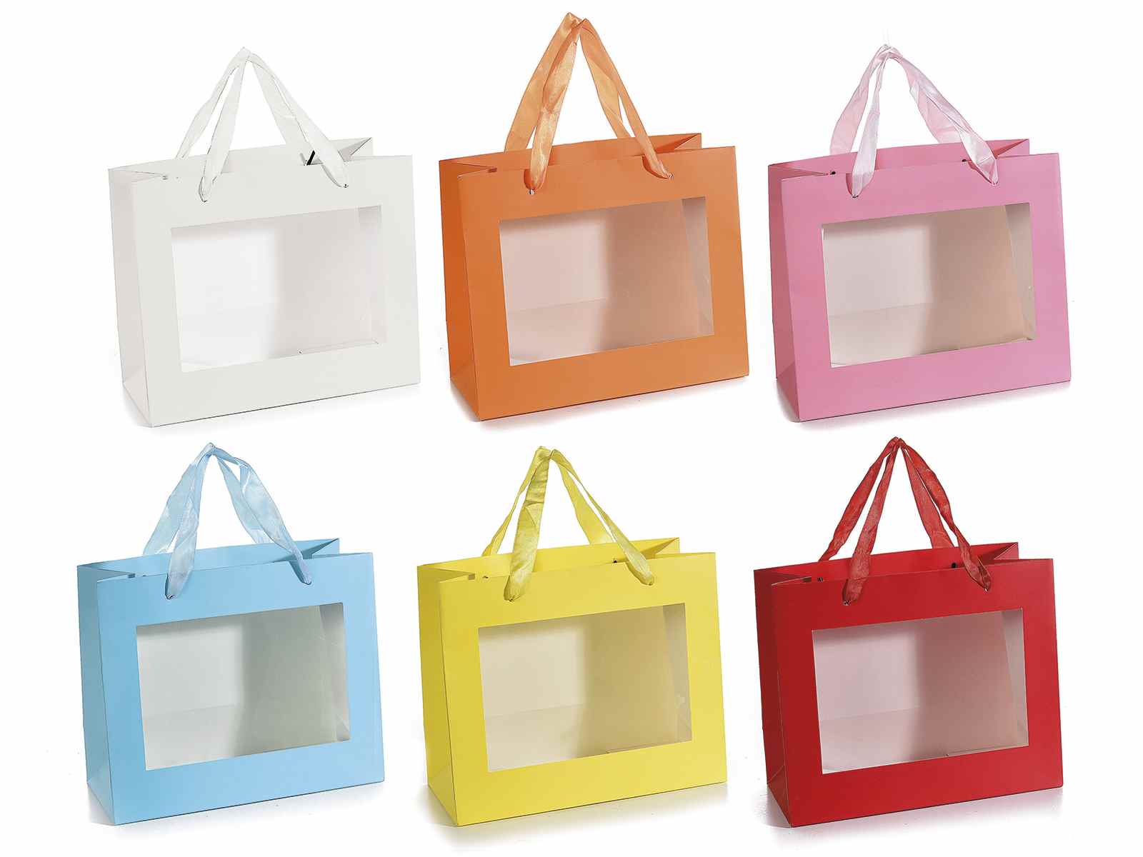 Grands sacs en papier coloré / cabas avec poignées en tissu et fenêtre
