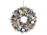 Couronne de Noël à suspendre avec nœud, boules rouges, pommes de pin enneigées et baies