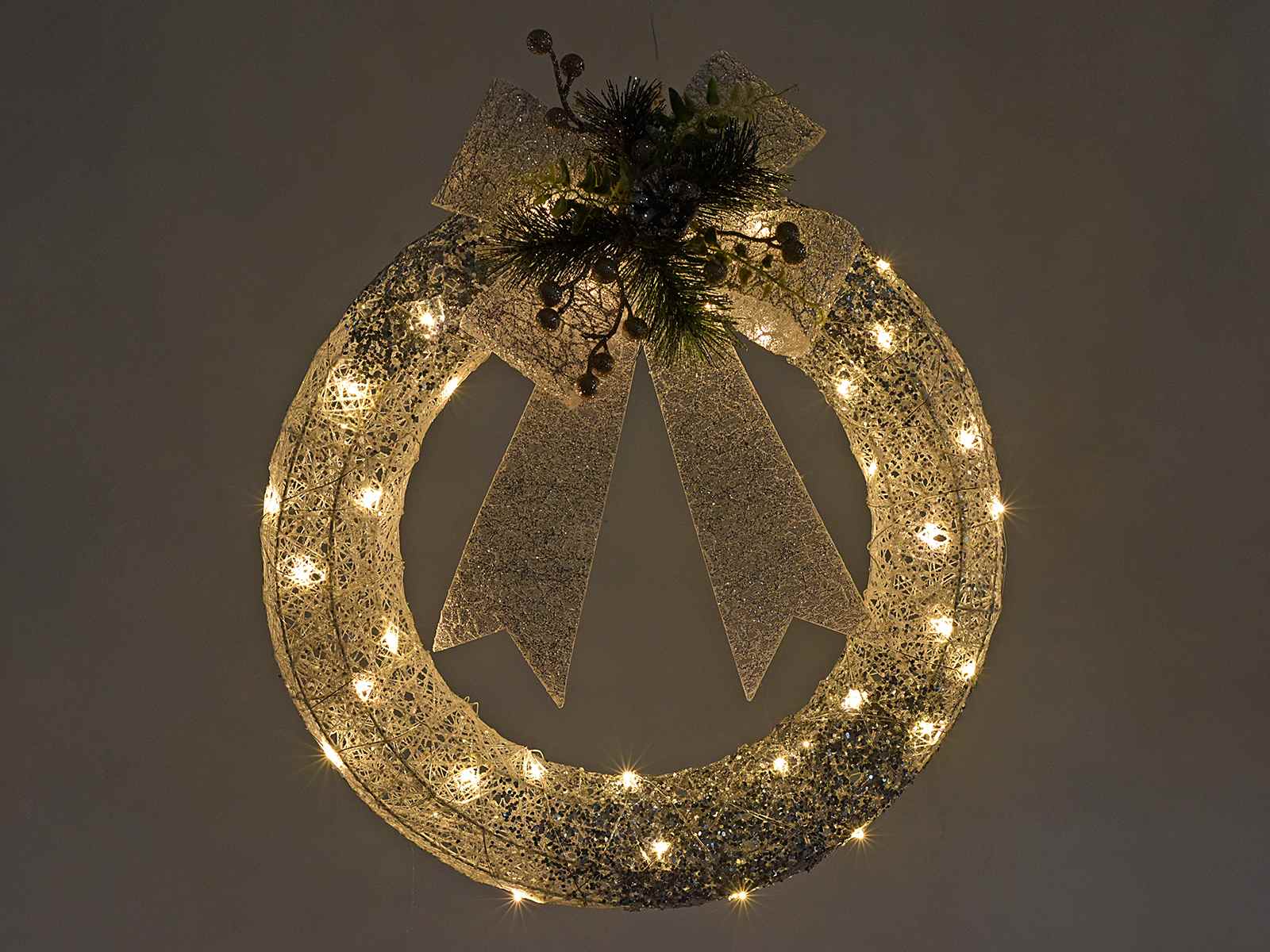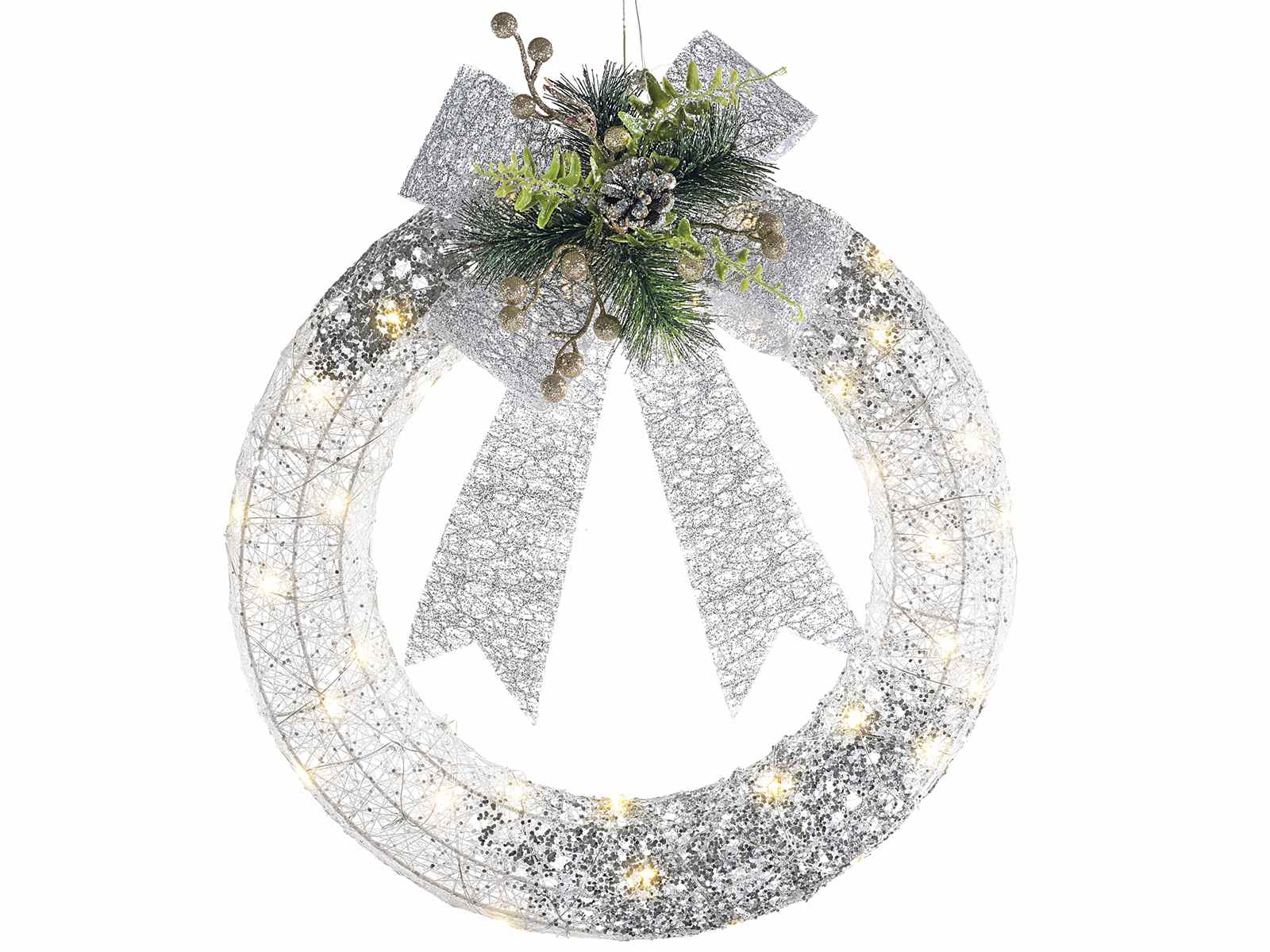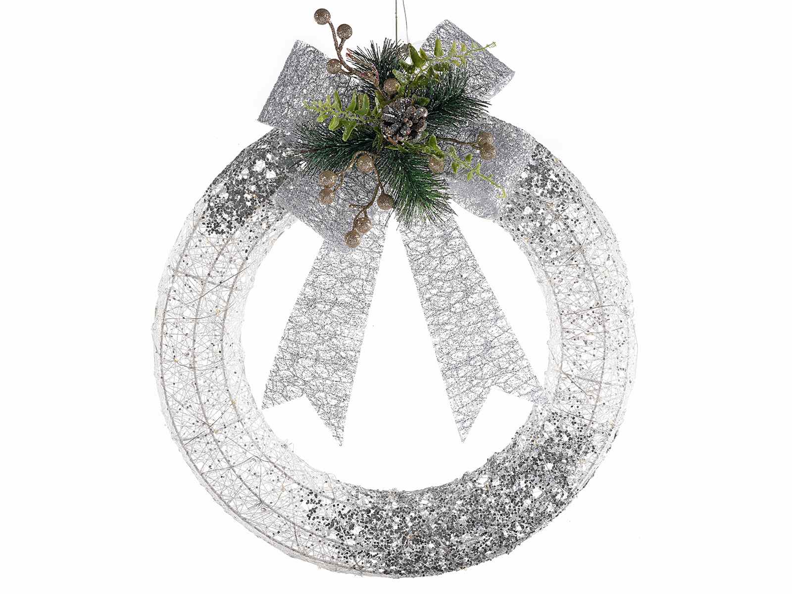 Couronnes de Noël en métal avec paillettes argentées, brindilles artificielles et lumières LED blanc chaud