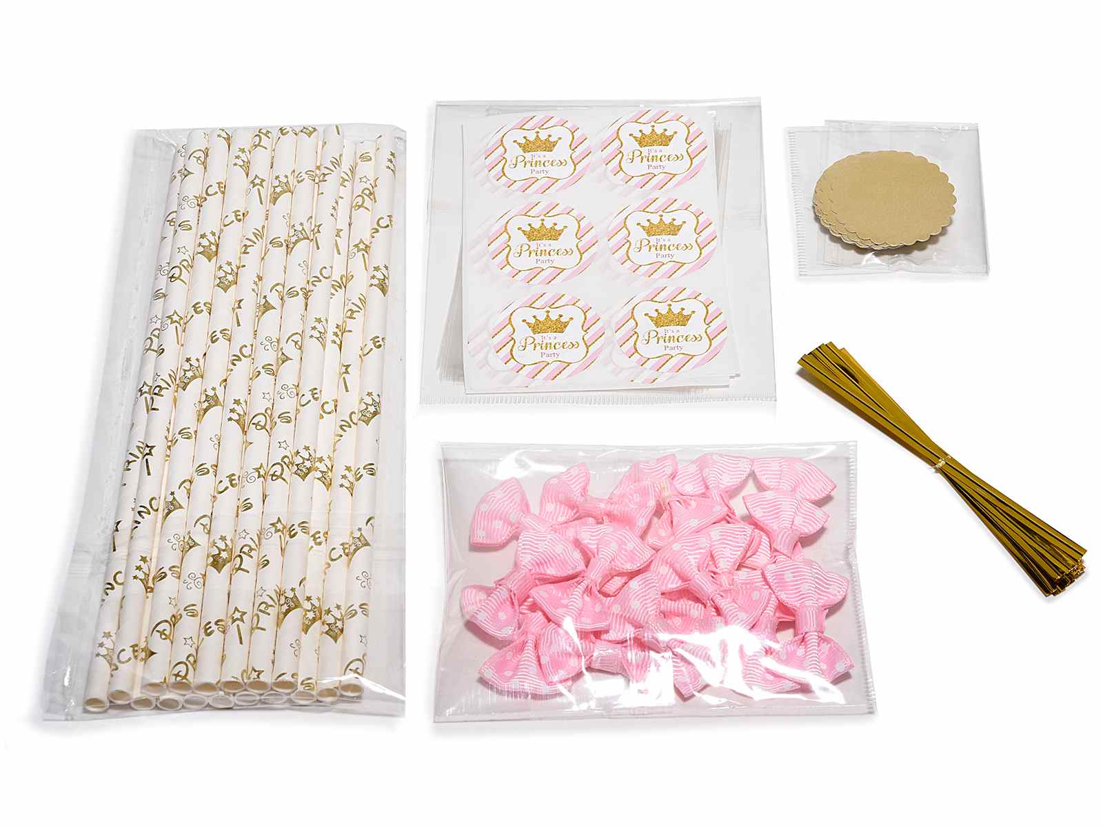 Kit de cadeaux pour bébé fille comprenant un bâtonnet de paille, un nœud rose et une étiquette décorative, conditionné en lot de 18. Parfait pour les baptêmes et les naissances, idéal pour emballer les cadeaux de baby shower.
