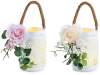Lanternes en métal avec bougie électronique et anse en corde, ornées d'une branche de rose en tissu blanc et rose, avec boutons et baies.