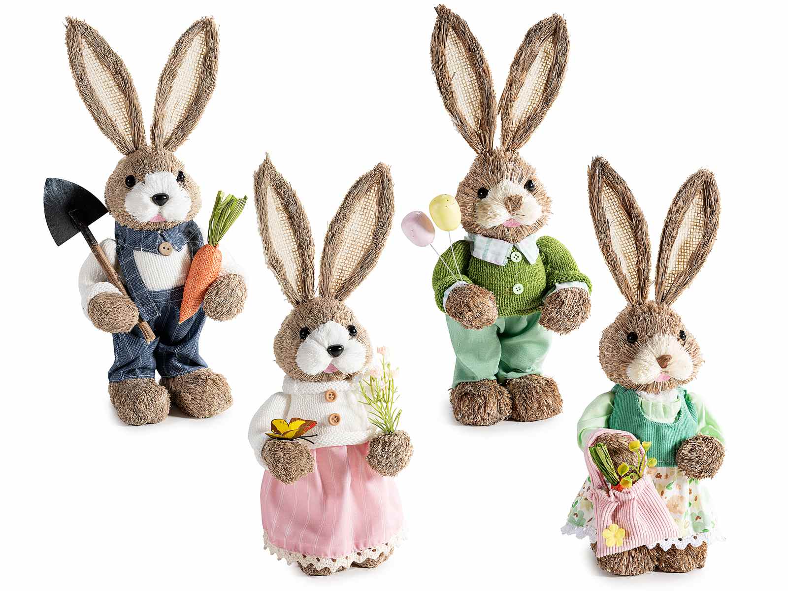 Lapins de Pâques en fibres naturelles, vêtus de robes en tissu et décorés de fleurs.