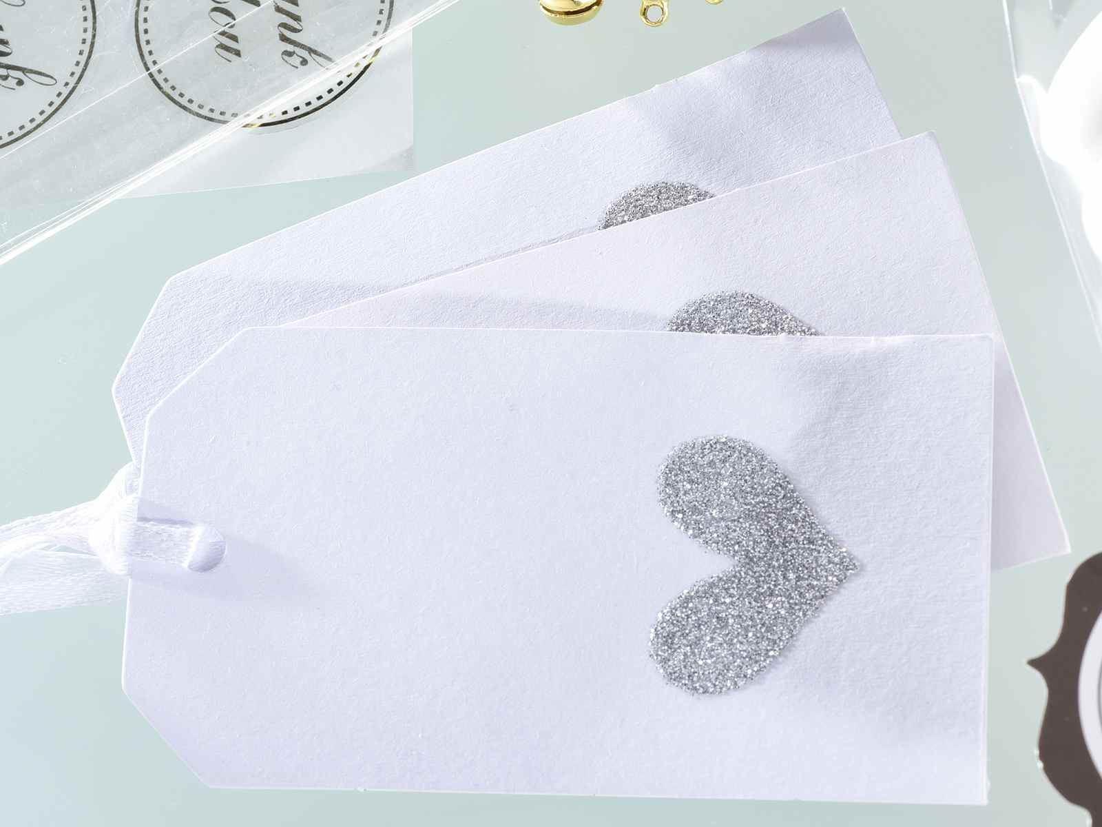 Lot de 50 étiquettes en papier blanc avec cœur pailleté