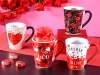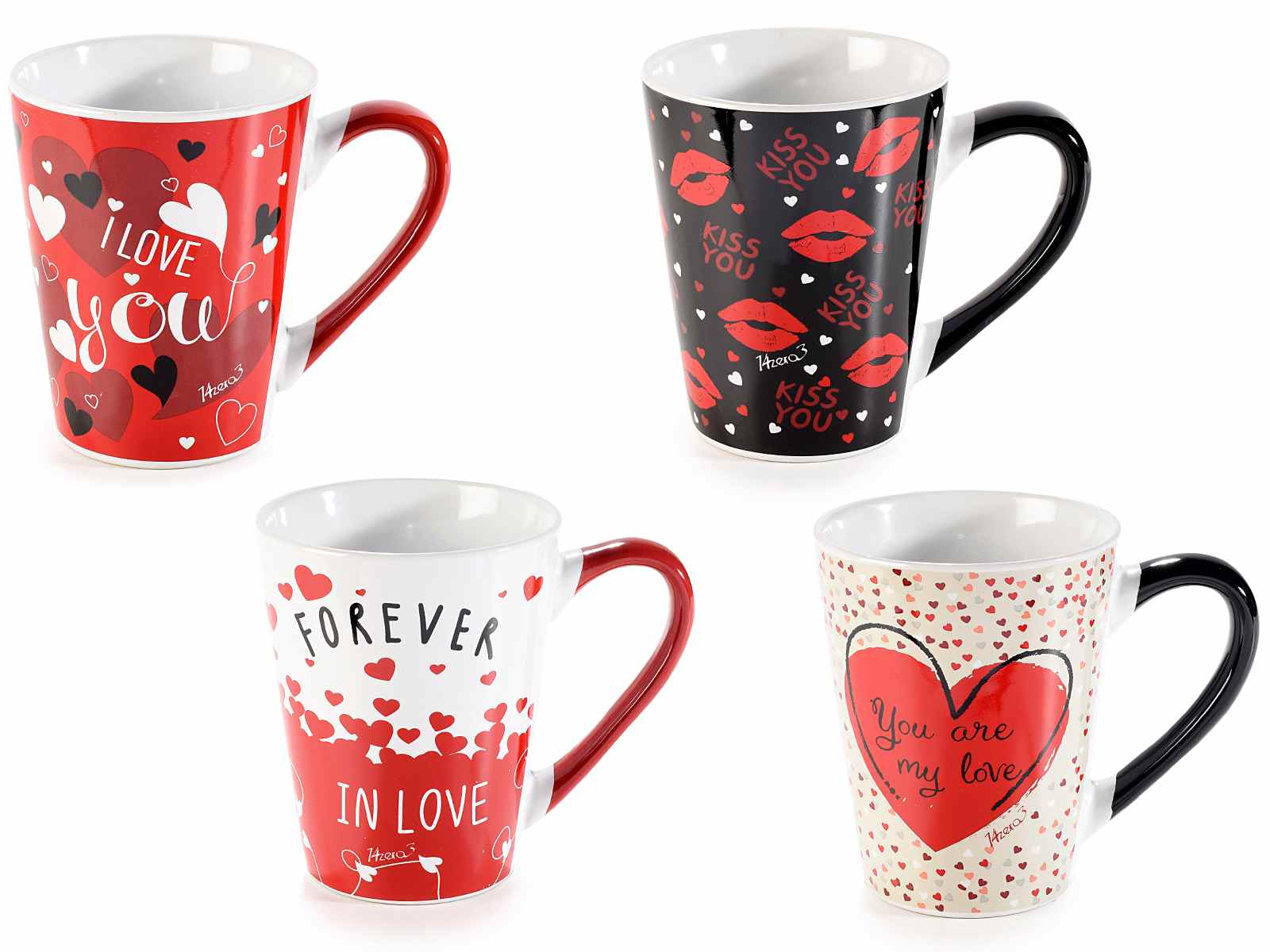 Tasses en céramique pour la Saint-Valentin avec des imprimés de cœurs, de baisers et les mots « Je t'aime / Amoureux pour toujours / Je t'embrasse / Tu es mon amour »