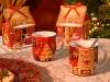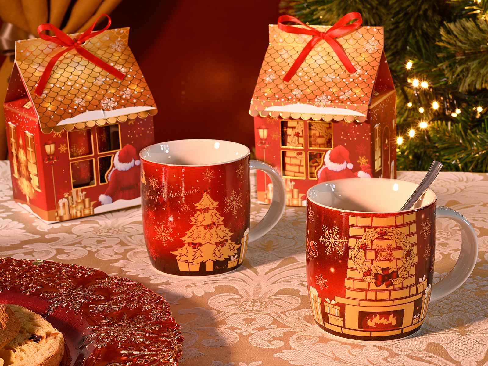 Tasses en porcelaine de Noël avec imprimé thématique et inscription « Joyeux Noël » dans une boîte cadeau en forme de maison avec un nœud