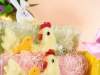 Paniers de Pâques en fibres naturelles colorées avec des décorations de Pâques d'une poule et d'un mouton