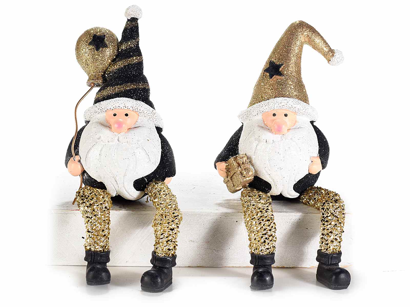 Père Noël décoratif en résine avec de longues jambes et des détails en paillettes dorées