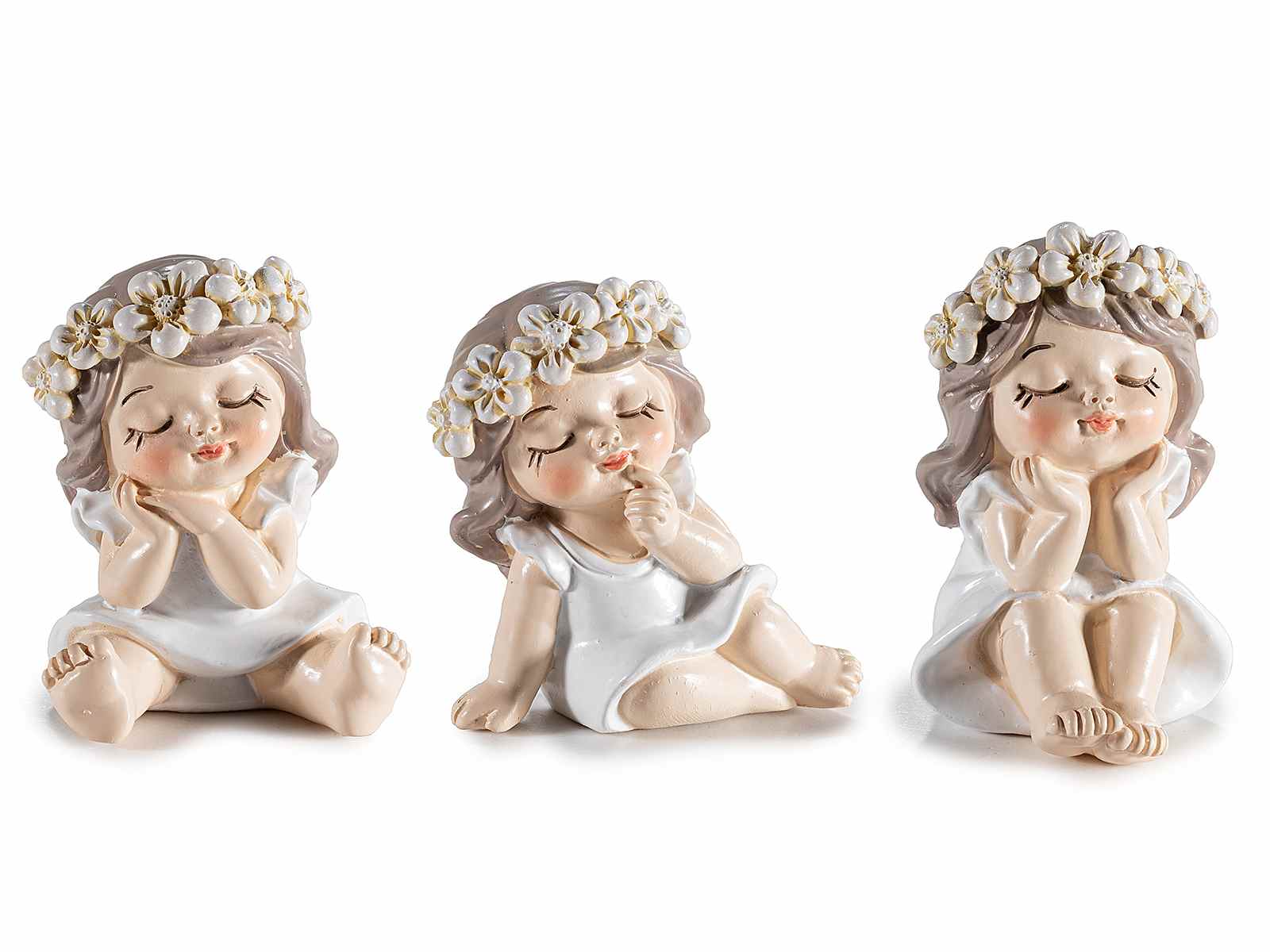Figurines de filles en résine colorée avec couronnes de roses, idéales comme petits cadeaux pour une fête de naissance.