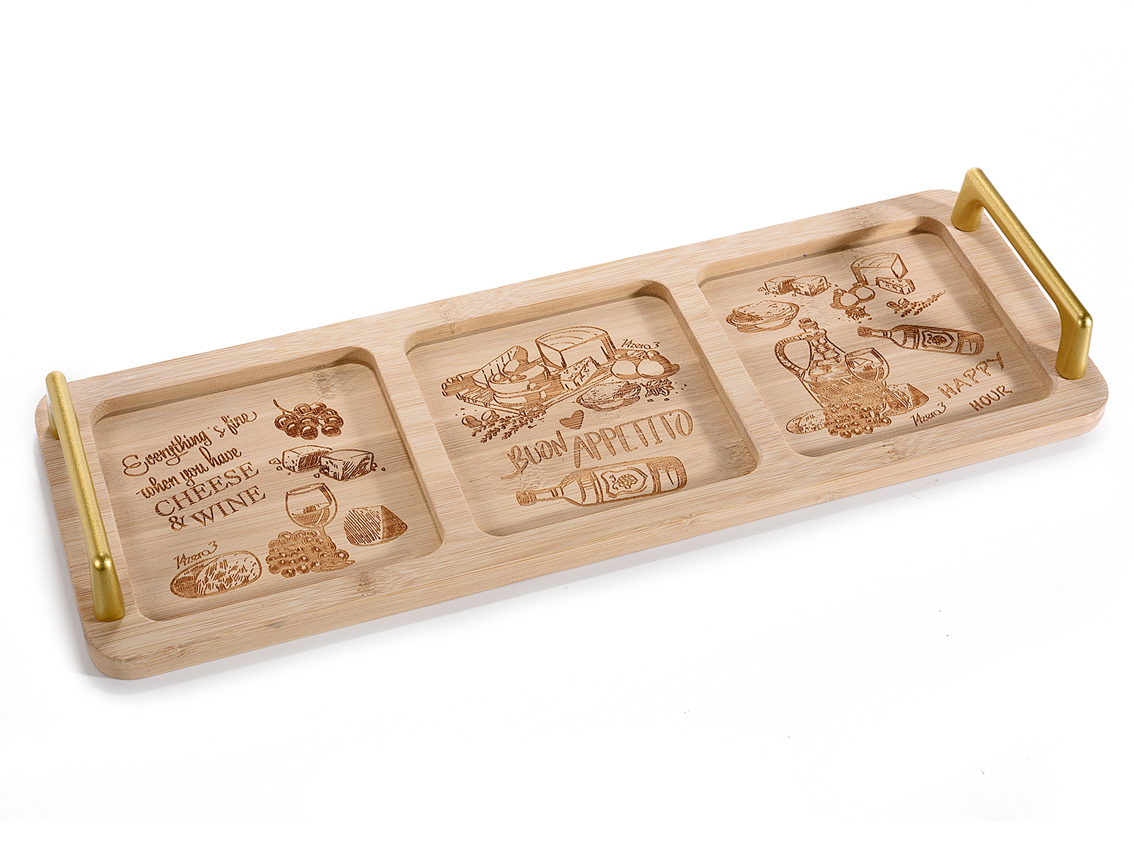 Plateau en bois à 3 compartiments et poignées dorées